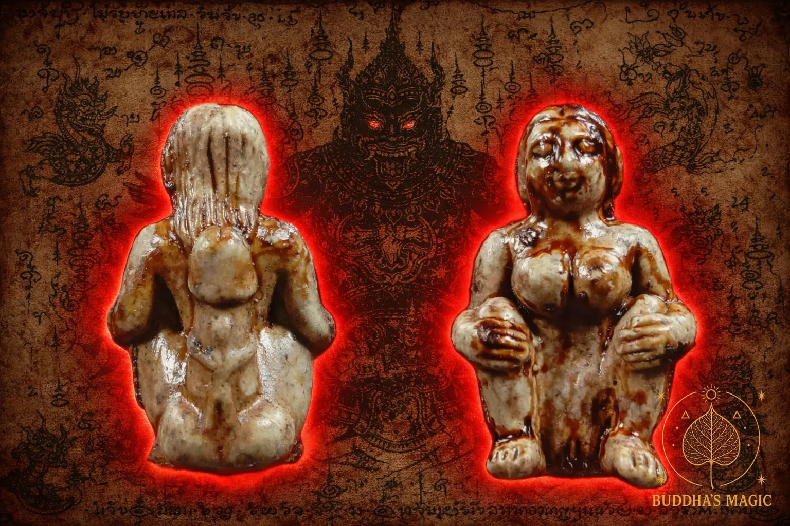Cette amulette représente Mae Nang Pim, également connue sous les noms de Mae Peuh Mahasané, une figure ésotérique majeure dans la tradition thaïlandaise des amulettes de charme et d’attraction.