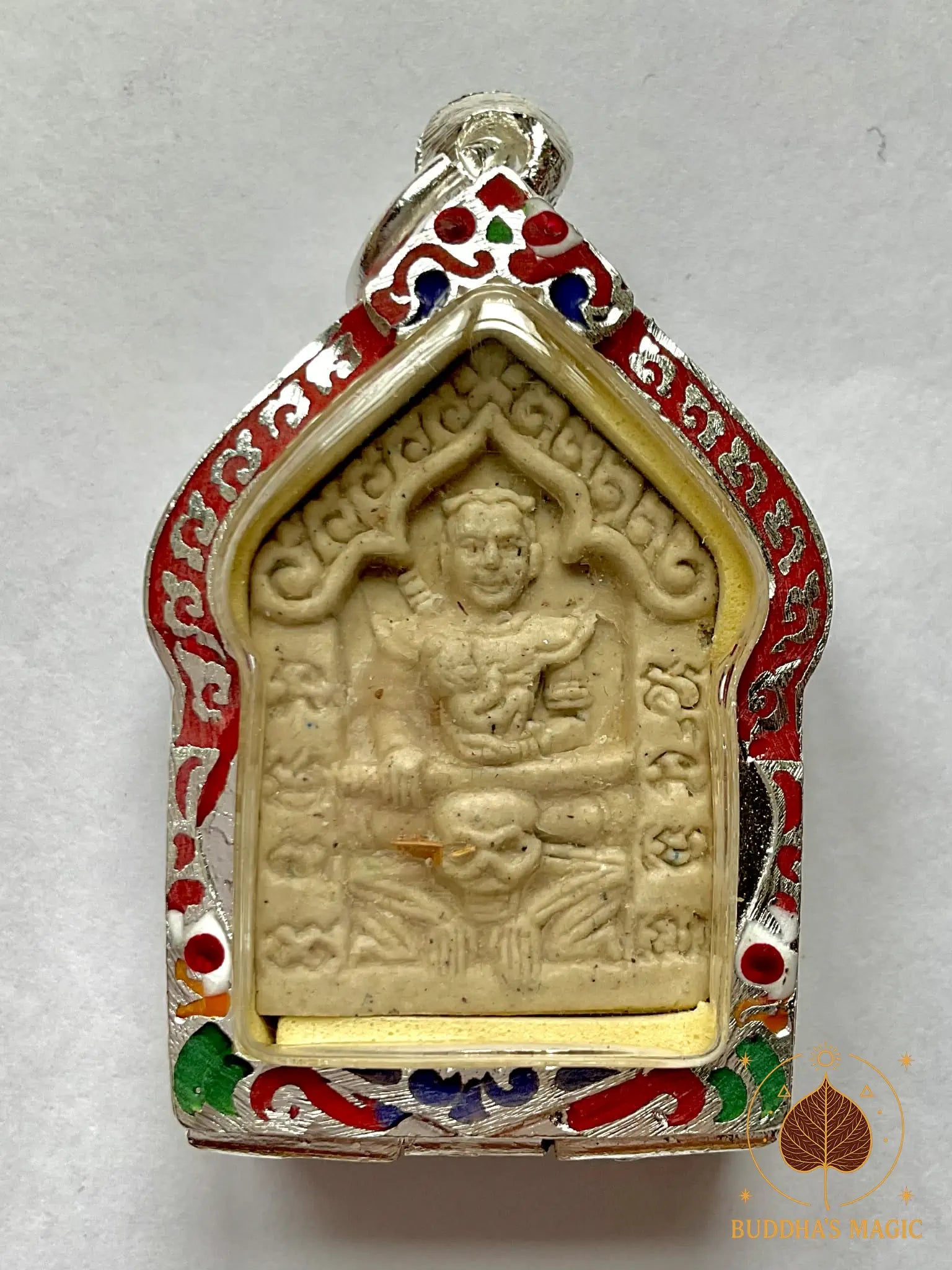 La face principale représente Phra Khunpen en guerrier, portant Khuman Thong dans ses bras ,et en dessous de lui on peut voir un squelette Hong Praï. Le revers présente un cheval cabré, symbole ancien de puissance, de mouvement rapide, de victoire et d’ascension sociale, très utilisé dans certaines lignées de Khunphaen orientées vers le succès matériel et l’autorité.
