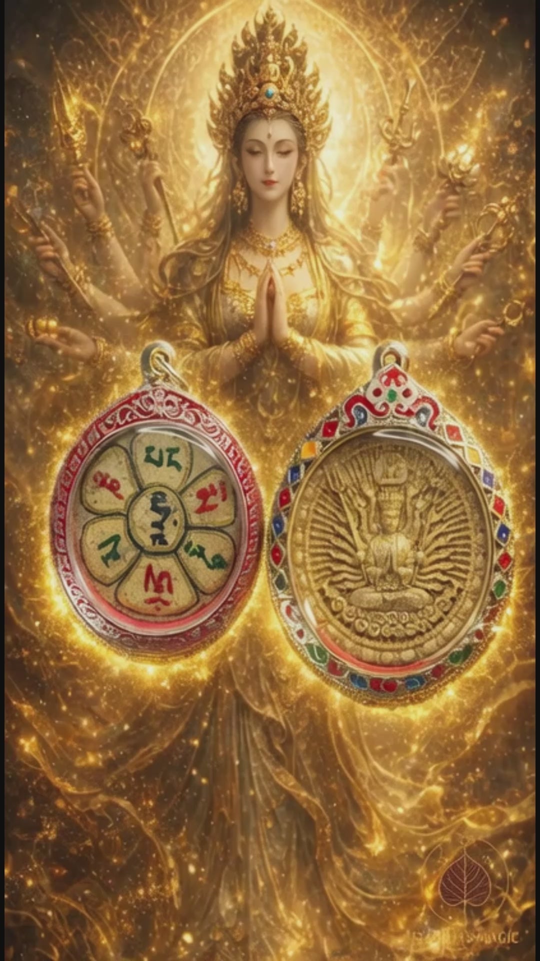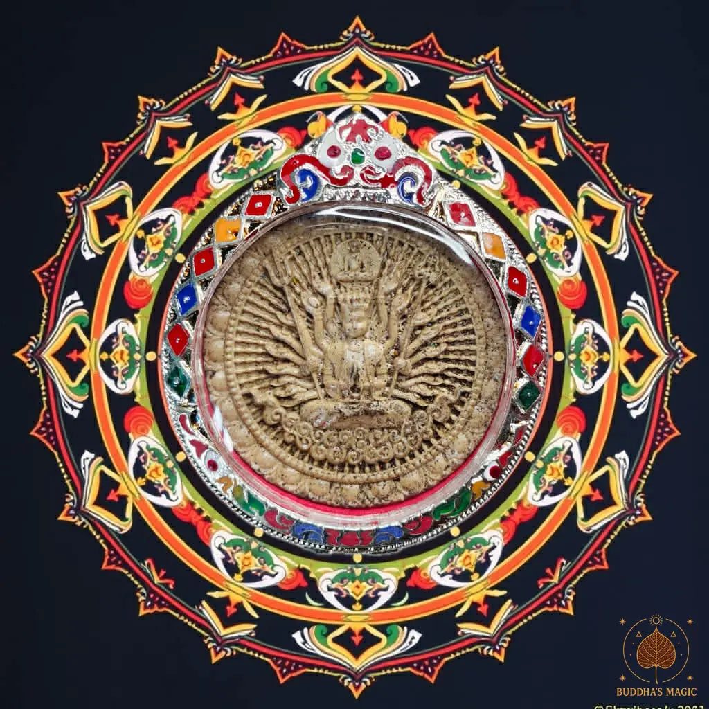 Cette amulette représente Chenrezi à mille bras, grande figure de compassion dans le bouddhisme, ici présenté dans une forme rayonnante et protectrice. Réalisée en résine sacrée, elle a été consacrée dans un temple chinois de Bangkok selon les rites traditionnels. La face principale montre la divinité assise dans sa gloire circulaire, entourée de ses multiples bras symbolisant sa capacité infinie à secourir les êtres.