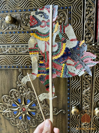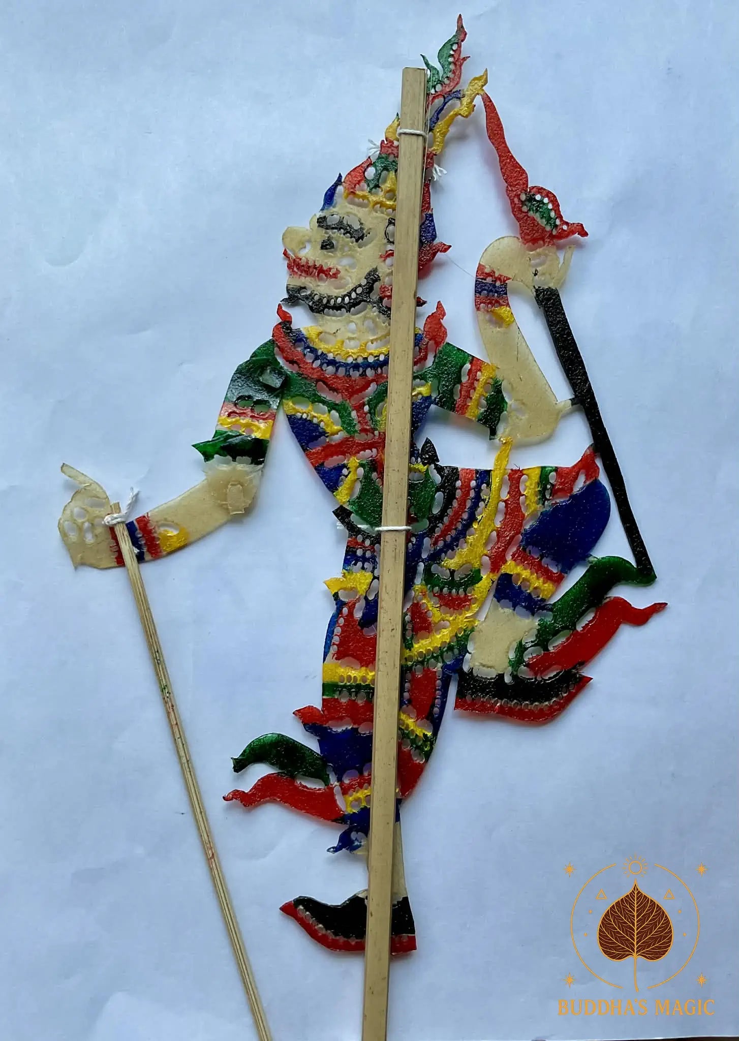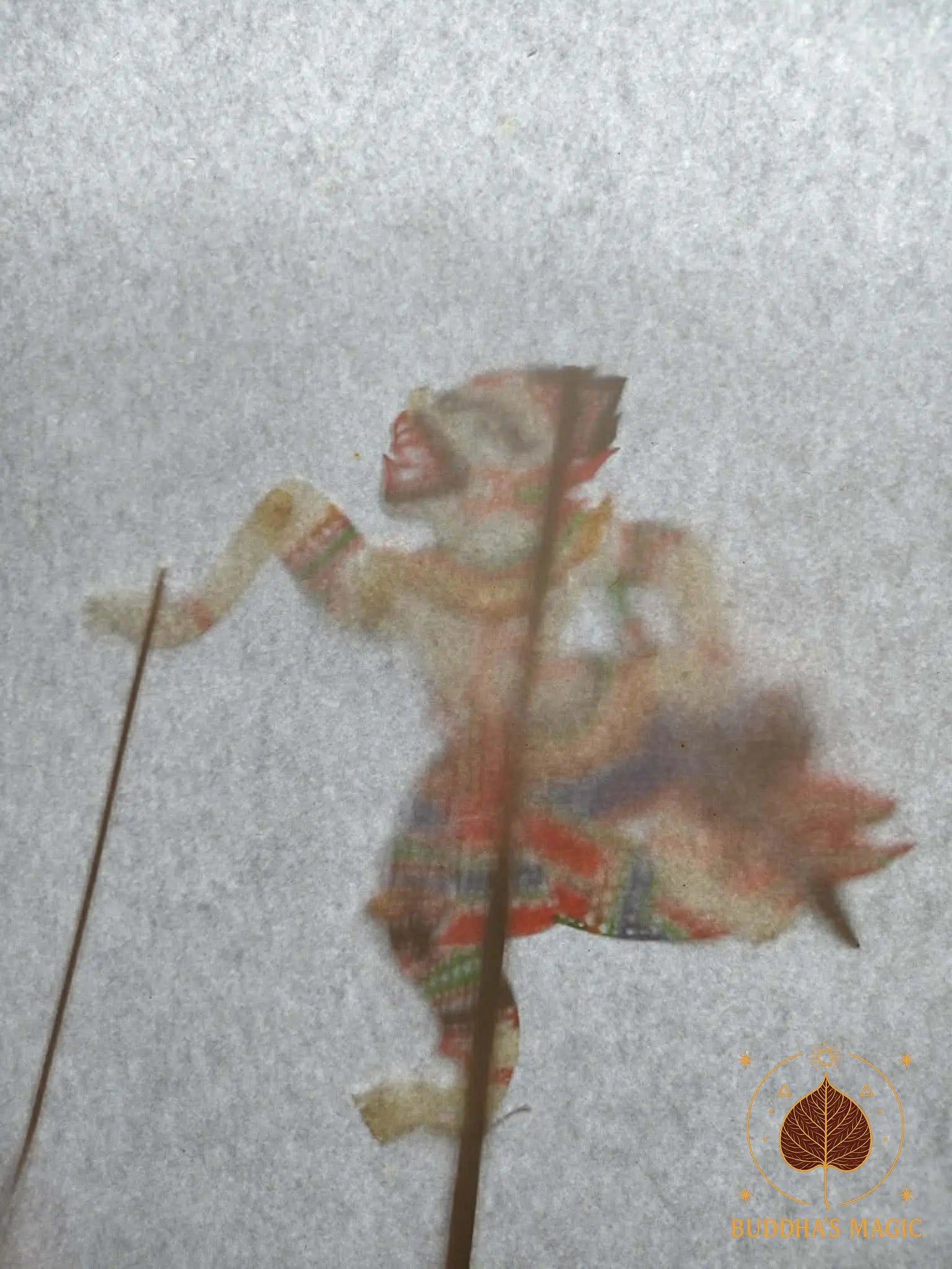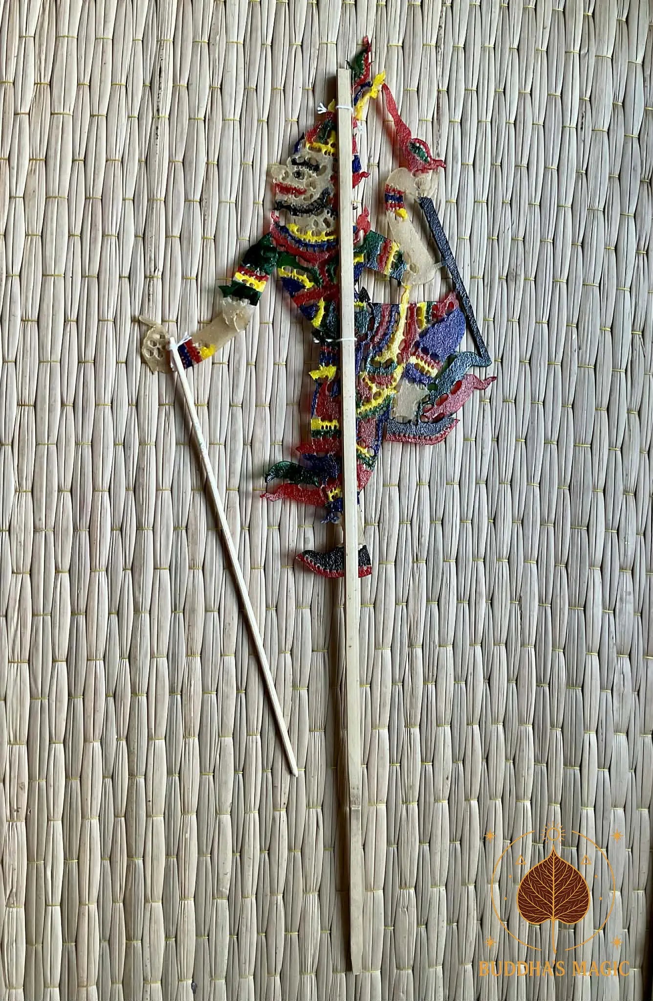 Ces marionnettes de théâtre d’ombre Nang Talung sont des pièces neuves, réalisées à la main en cuir de buffle d'eau et obtenues directement auprès de l’artisan. Elles perpétuent une tradition ancienne du sud de la Thaïlande, mêlant art populaire, spiritualité et narration symbolique.