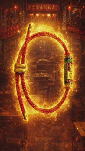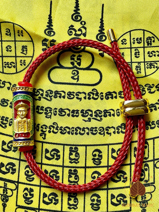 Le bracelet est composé d’un cordon sacré rouge tressé, couleur traditionnellement associée à la chance, à l’énergie active et à la réussite. Il est orné de deux cylindres rituels émaillés : l’un représentant Er Ger Fong, l’autre gravé de symboles magiques et de yants spécifiques à la prospérité et au hasard favorable.