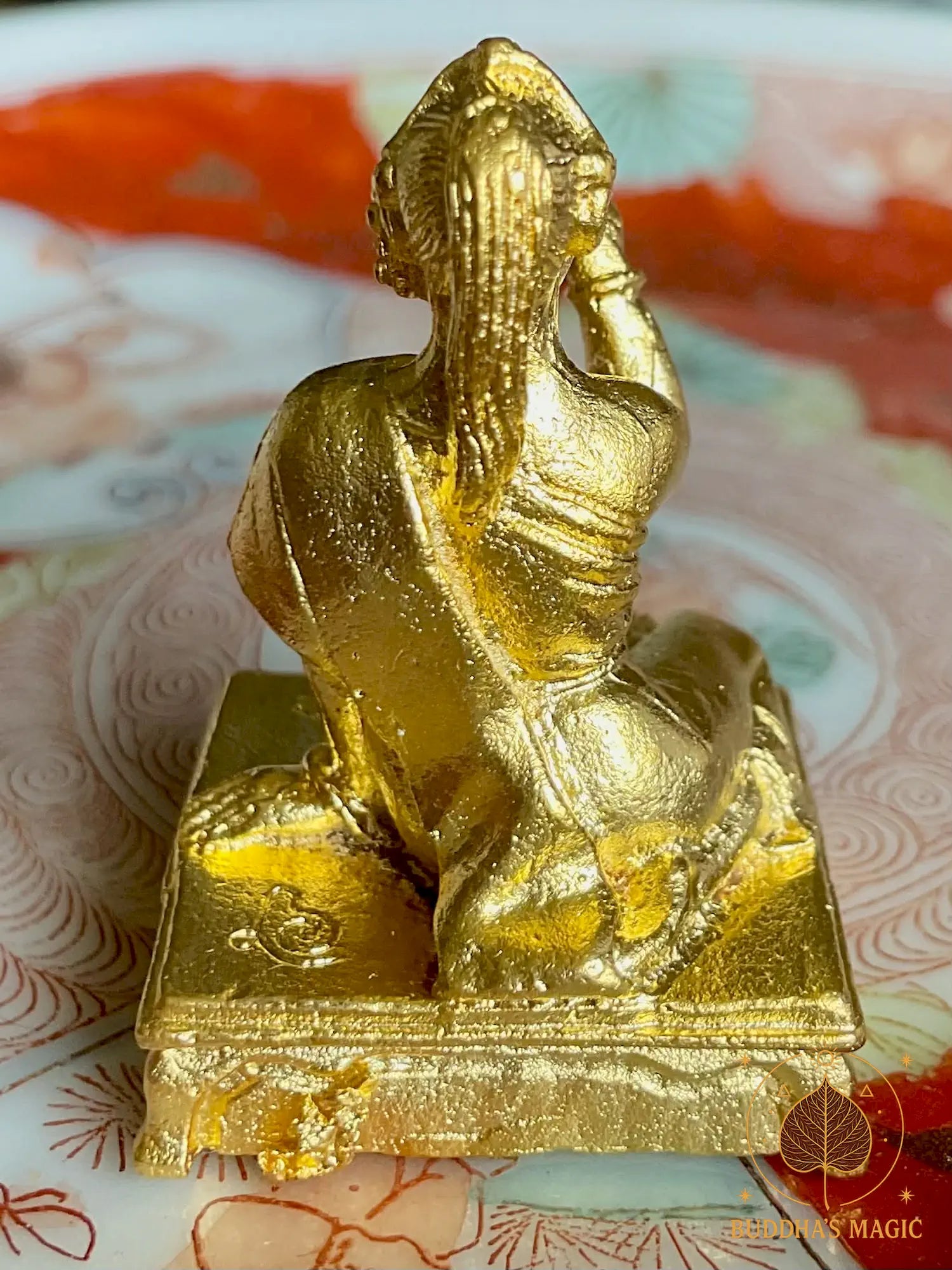 Dans cette représentation classique, Mae Nang Kwak est agenouillée dans une attitude d’appel de la fortune, invitant la chance, les clients, les opportunités financières et les soutiens favorables. La dorure très lumineuse renforce son aspect sacré et en fait une statuette idéale pour un autel personnel ou un commerce souhaitant attirer une énergie prospère et harmonieuse.