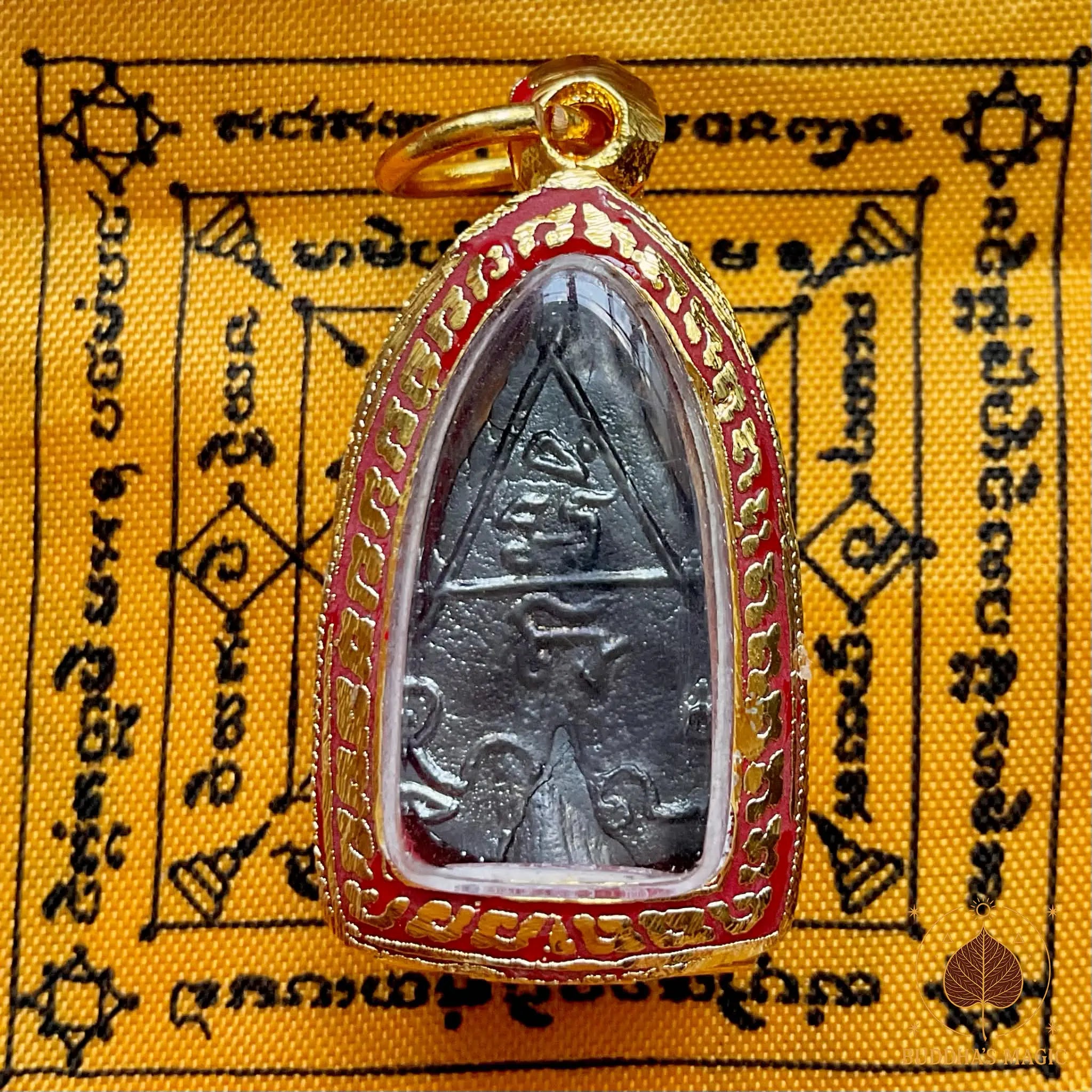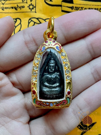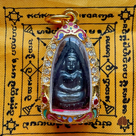 Superbe amulette Phra Gribua (le Bouddha en pétale de lotus), réalisée en alliage alchimique Mekkapat sombre. Cette pièce provient du Wat Klang Bang Kaew (Nakhon Pathom), bénie lors de la grande consécration de 2017.