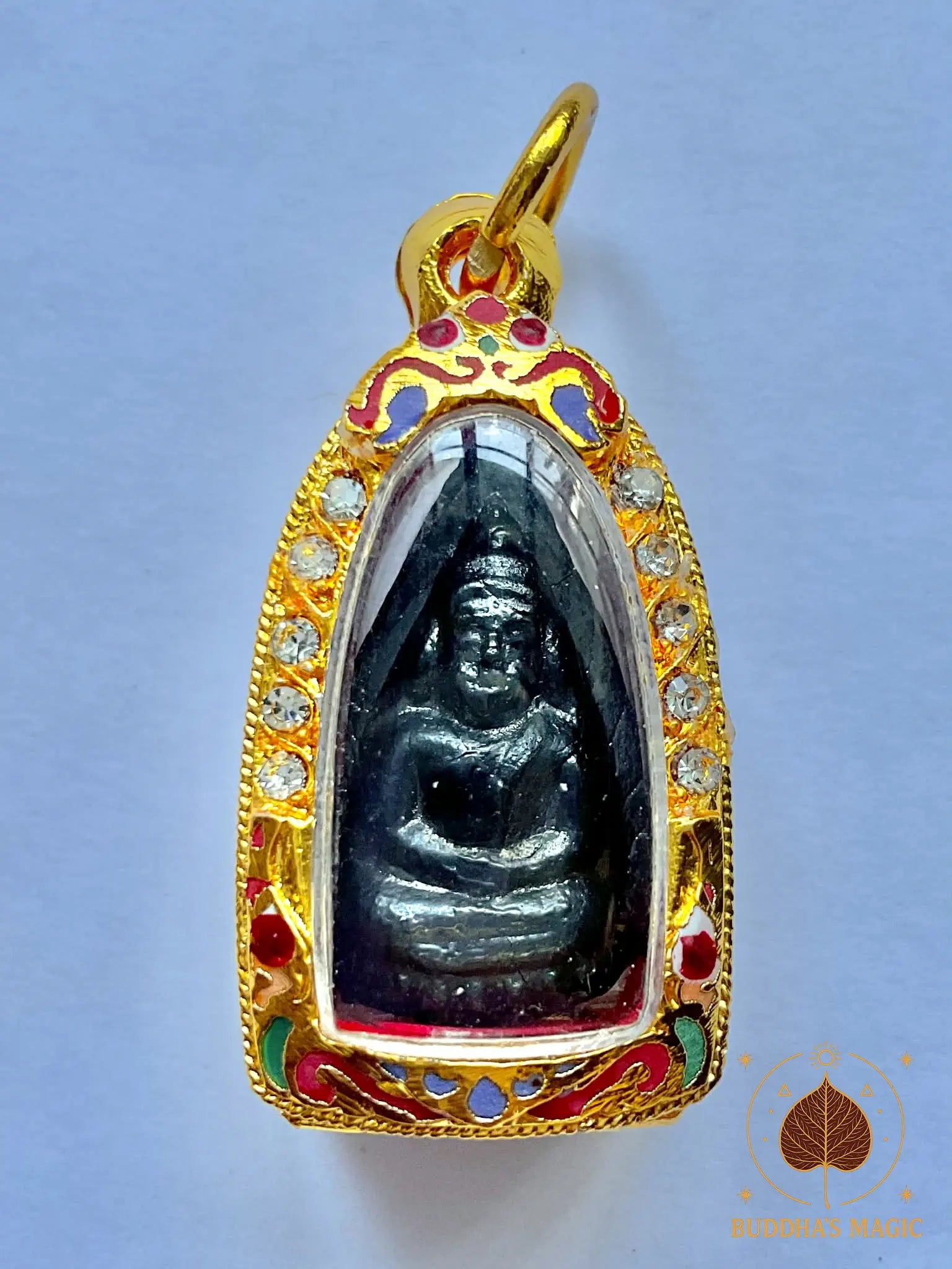 Le Bouddha est ici représenté dans la posture méditative, assis sur un pétale de lotus, symbole d’émergence hors des impuretés, de victoire de l’esprit sur le monde et de paix intérieure. Le métal sombre lui confère un style sobre, mystique et puissant. Le reliquaire doré et émaillé met en valeur la pièce avec élégance.