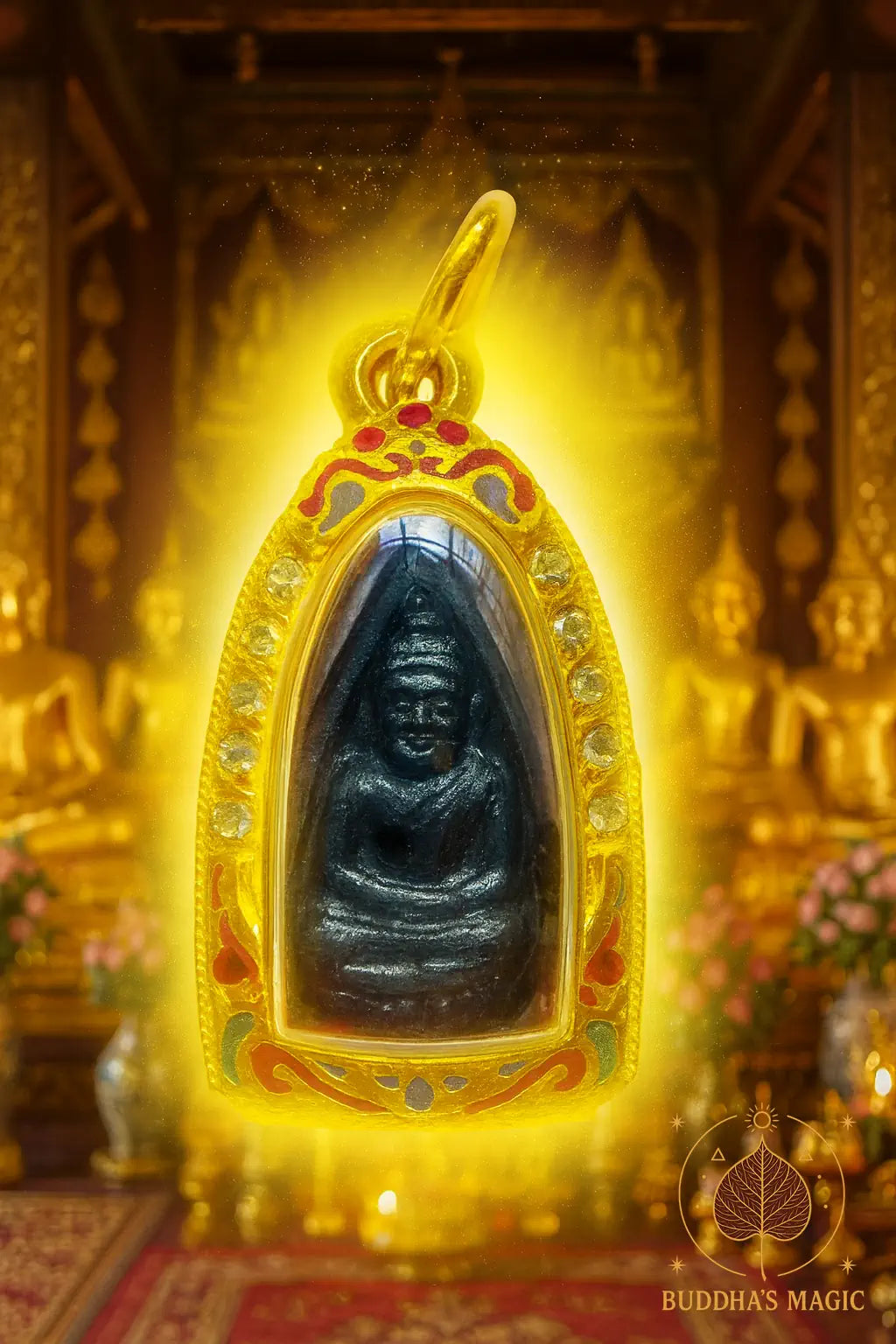 🌙 Dans le métal noir comme la nuit où naquit l’ancienne bénédiction, la forme du Bouddha apparaît, paisible, immobile, éternelle. Le pétale de lotus le porte comme la sagesse porte le cœur sincère. Celui qui garde cette amulette reçoit un écho du passé : cent ans de prières, cent ans de dévotion. La lumière traverse le temps, et dans la paume du porteur, elle devient talisman de paix.