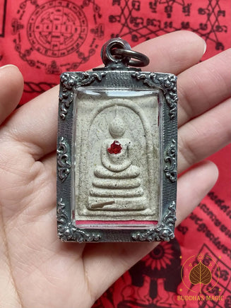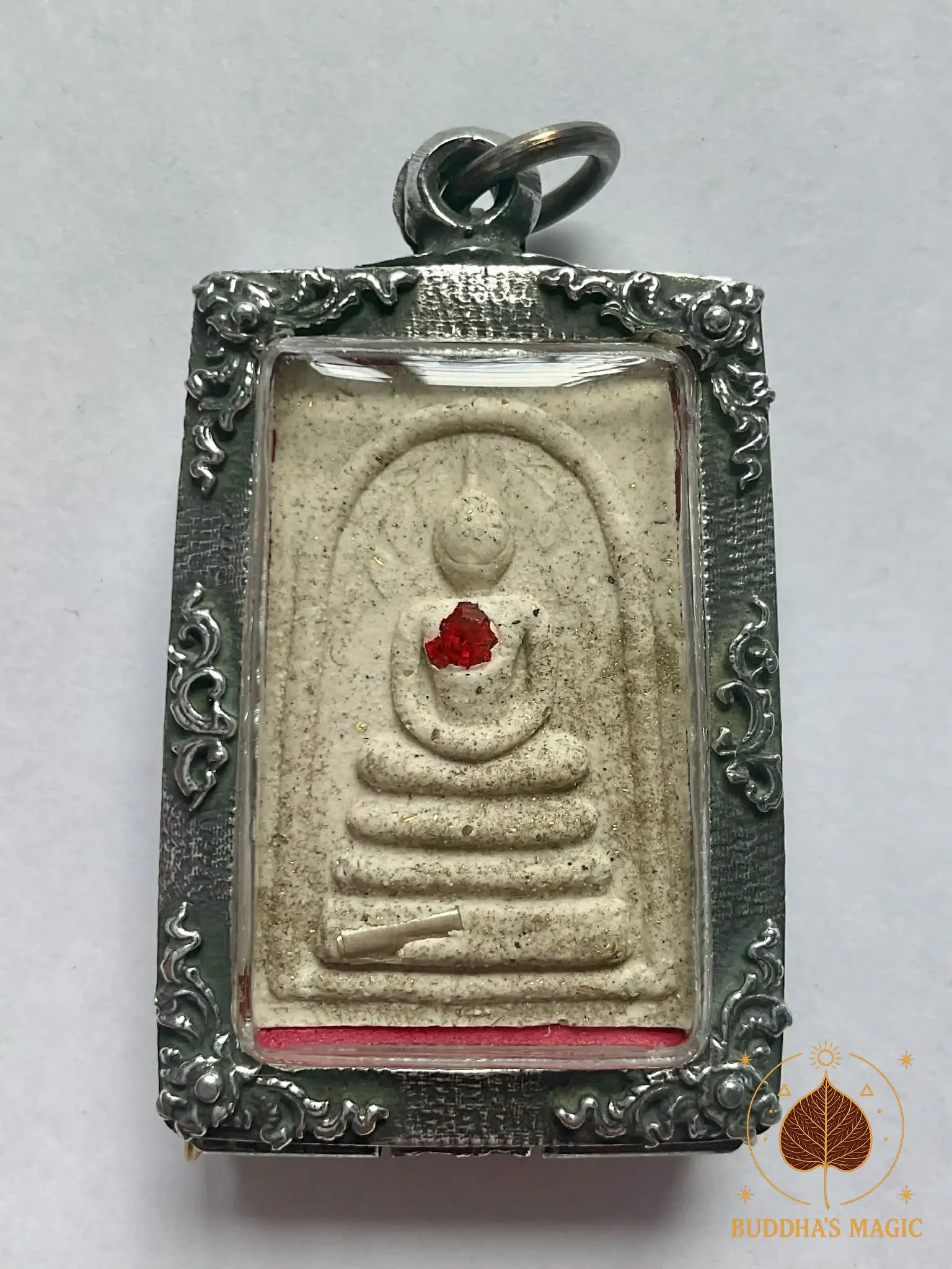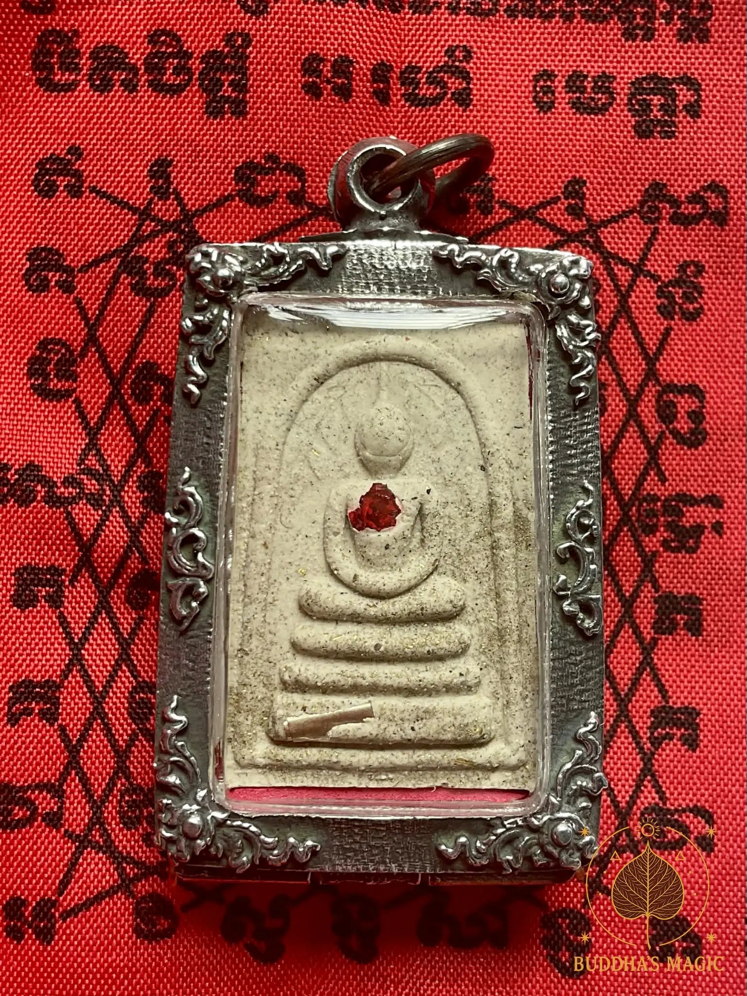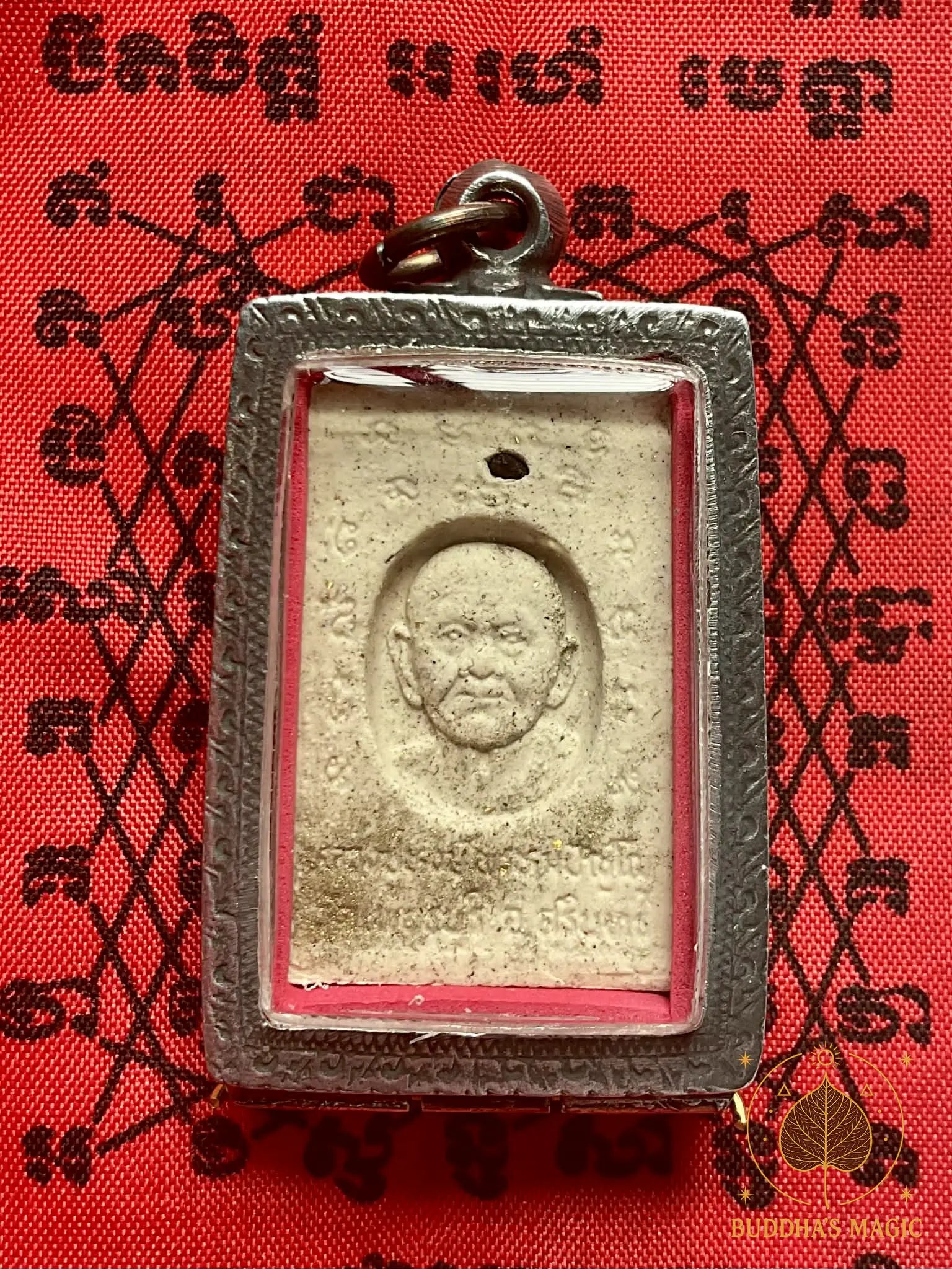 L’amulette est composée d’un mélange sacré d’argiles issues de sites spirituels, enrichi de poudre d’or provenant des offrandes du Wat Petchaburi, ainsi que d’herbes médicinales réduites en poudre selon les méthodes traditionnelles.