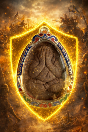 Cette amulette représente Phra Pidta, figure majeure de la tradition bouddhiste thaïlandaise, connue pour ses puissantes vertus de protection, fermeture des influences négatives et préservation de la paix intérieure.