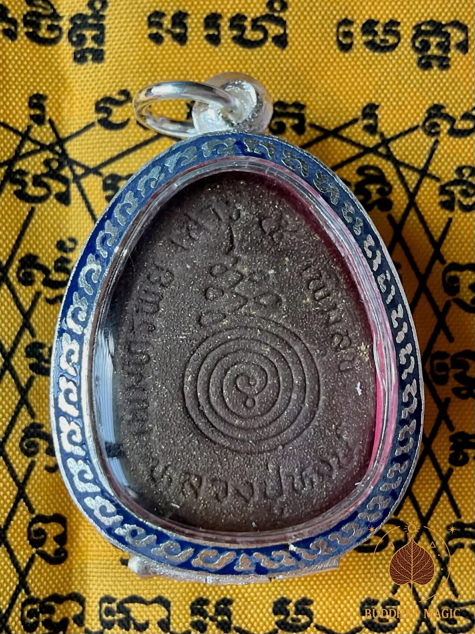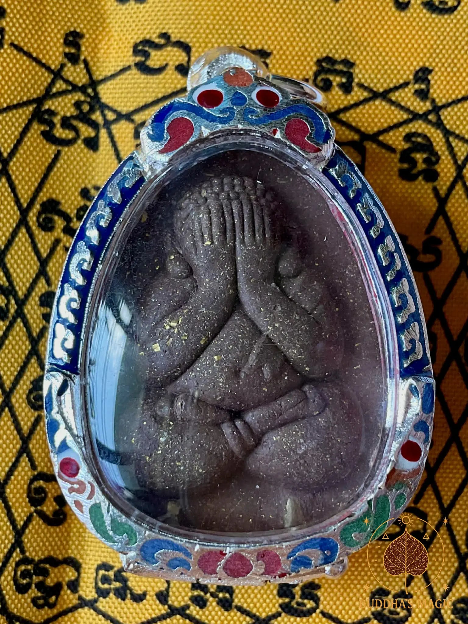 Cette amulette a été réalisée à partir de poudre sacrée Phong Neung Roi Perth Wan, une préparation traditionnelle composée de 108 plantes sacrées, utilisée depuis des générations pour la protection, la stabilité et l’harmonie. Elle contient également de l’or issu des offrandes du temple, intégré à la matière lors de la fabrication.