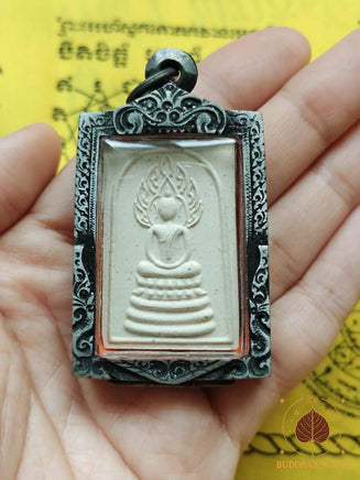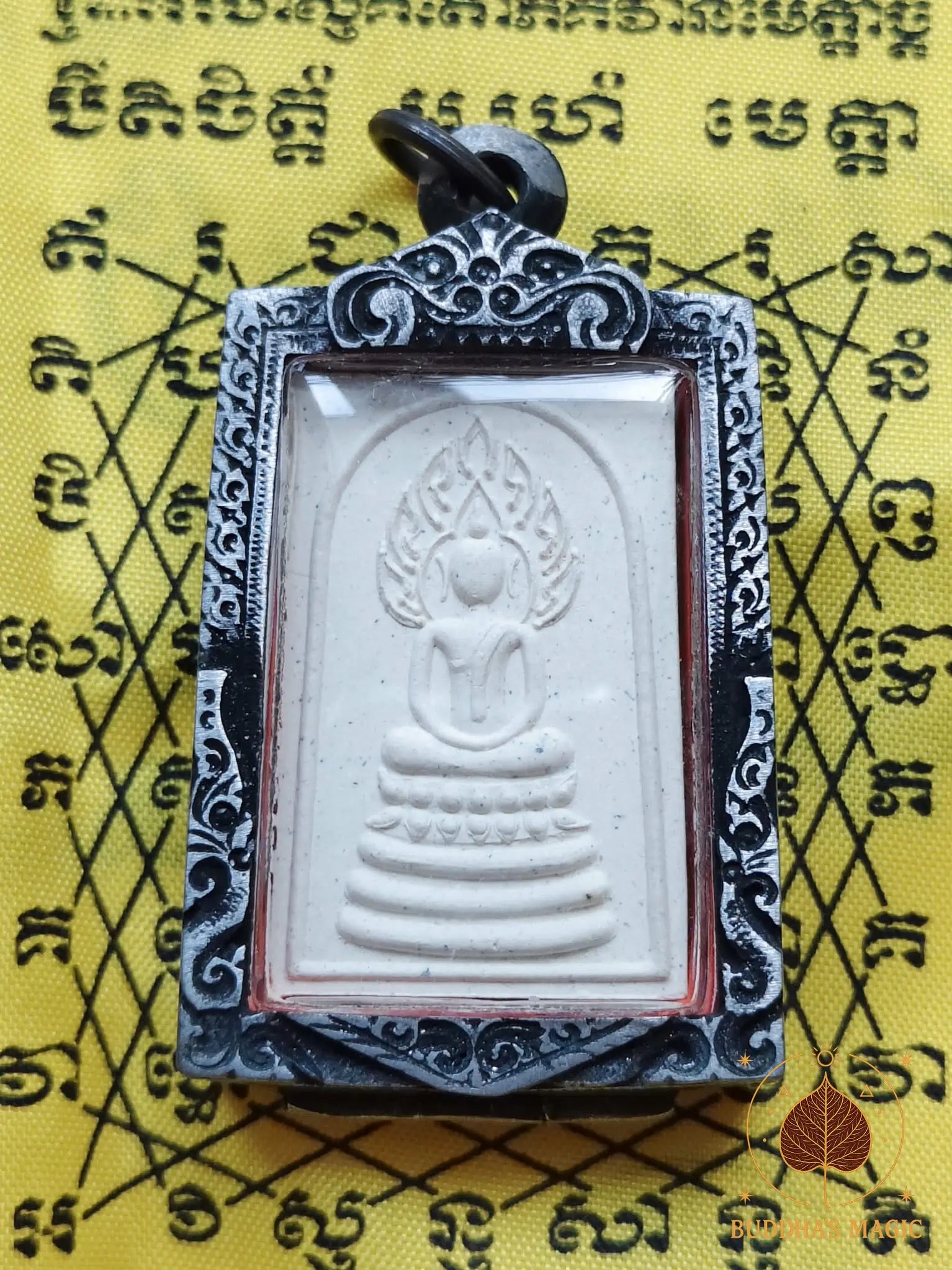 Le Phra Somdej Naphok se distingue par la représentation du Bouddha en posture de méditation, assis sur un socle à trois niveaux avec derrière lui le Roi des Nâgas stylisé. Cette iconographie est traditionnellement associée à la protection élevée, à l’élévation karmique et à la stabilité intérieure.