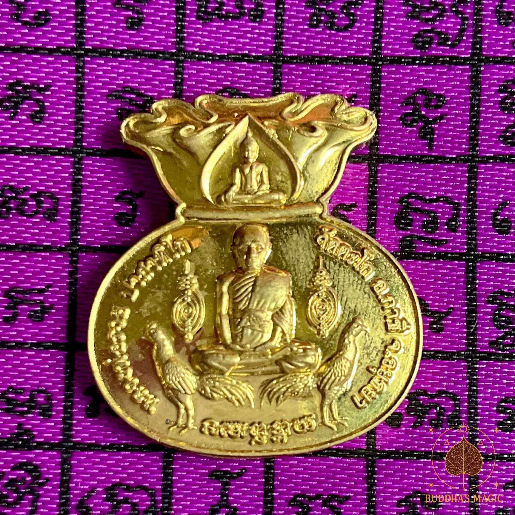 Sur la face avant, on trouve le vénérable Luang Phor Ruay assis entre deux coqs de combat, symboles de chance rapide, de combativité victorieuse et de prospérité. Sur le revers figurent Mae Nang Kwak (déesse de l’appel des clients) à gauche, et une seconde déesse de fortune à droite, encadrant le yant de Luang Phor Ruay – sceau sacré attirant richesse, clients et continuité financière.