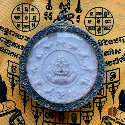 Au dos de l'amulette on trouve Phra Rahu entouré des animaux du zodiaque chinois.