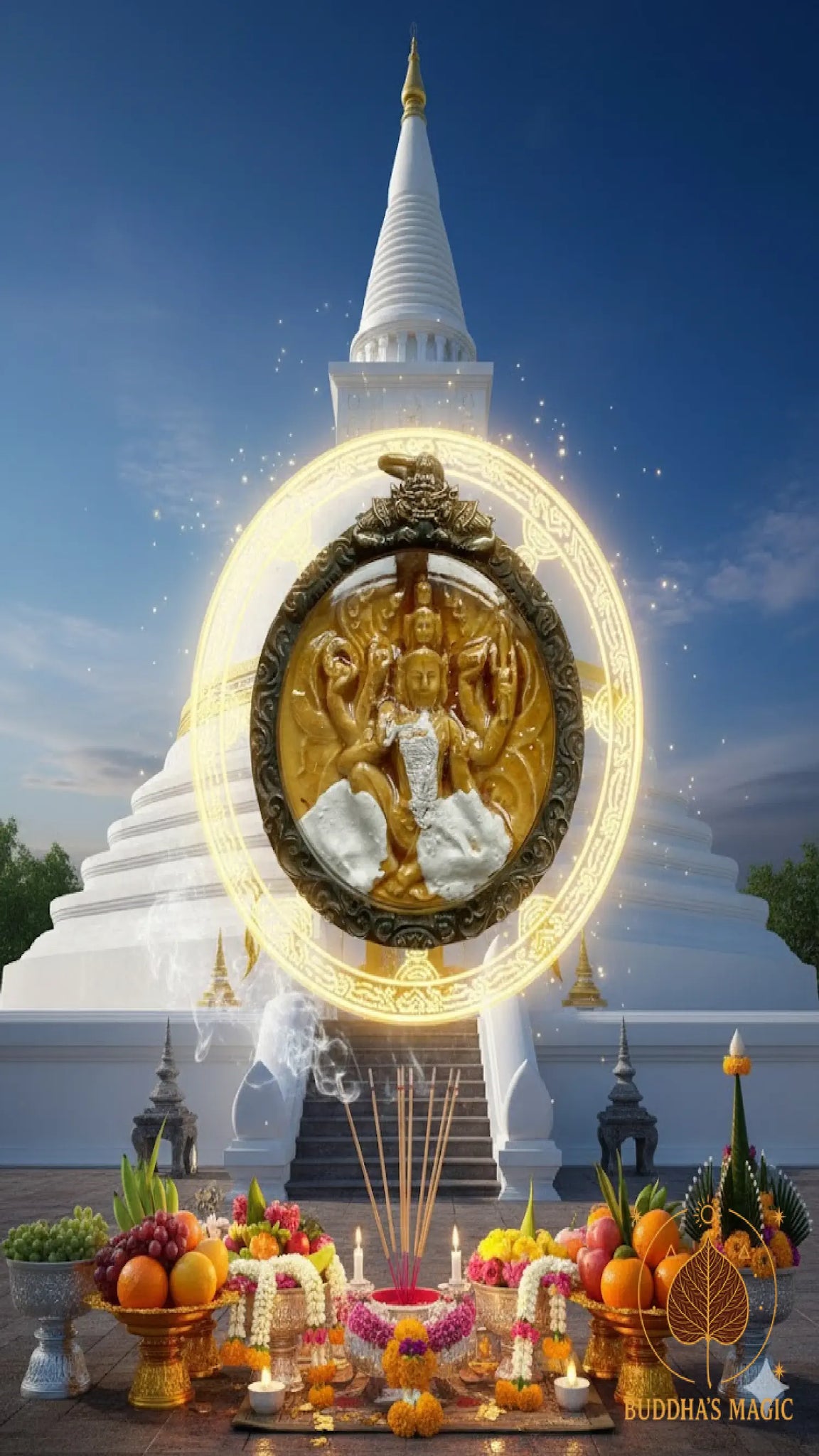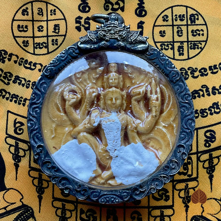 L’amulette proposée se distingue par la présence de pâte de consécration blanche sur l'avant de la pièce. Elle a également bénéficié d’un point très particulier pour les collectionneurs et les pratiquants : elle a été re consacrée individuellement par le Jao Wat du temple pour un donateur membre du comité du temple. Ce type de bénédiction personnelle donne souvent à l’objet une empreinte plus intime, orientée vers une intention précise de mérite et de soutien au temple.