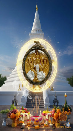 Dans la tradition du Sud de la Thaïlande, Jatukham Rammathep est invoqué pour la protection, la réussite et l’ouverture des voies matérielles quand l’intention reste droite. La version neuf visages symbolise une présence plus complète, capable d’observer les directions et d’agir comme un gardien, tout en renforçant l’aspect prospérité de cette édition.