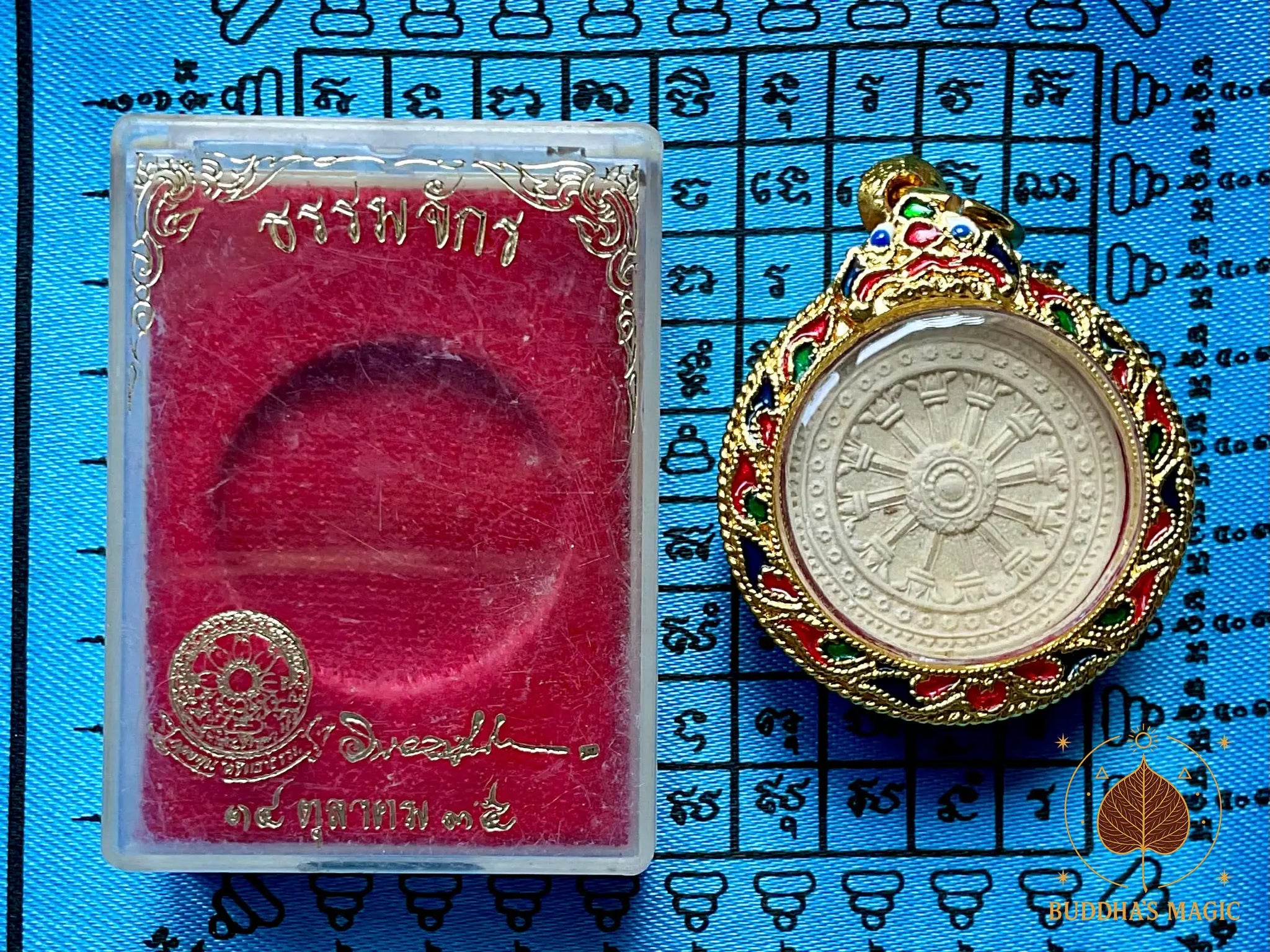 Cette amulette circulaire met en avant le Dharmachakra, la roue de l enseignement bouddhique, symbole de la Loi, de la transmission et de la voie juste. Elle a été bénie le 14 octobre 1992 par le trÚs vénérable Luang Phor Noi du Wat Thammasala, dans la province de Nakhon Pathom.
