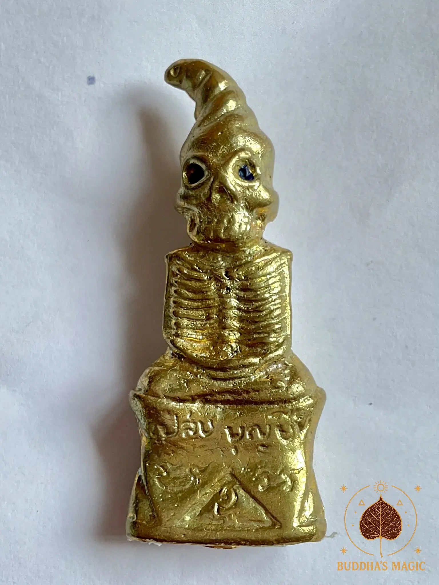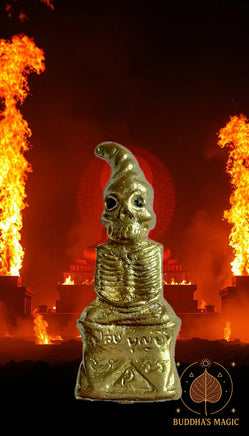 Ce Phra Ngang se distingue immédiatement par sa représentation : le corps est sculpté sous forme de squelette, symbole direct de rupture karmique, de domination des influences négatives et de canalisation des énergies occultes. Autre particularité exceptionnelle : les yeux bleu marine, là où la quasi-totalité des Phra Ngang traditionnels utilisent des yeux rouges. Ce choix renforce l’aspect « absorbant » et protecteur de l’amulette, rappelant les grands rituels de neutralisation des entités errantes (Praï).