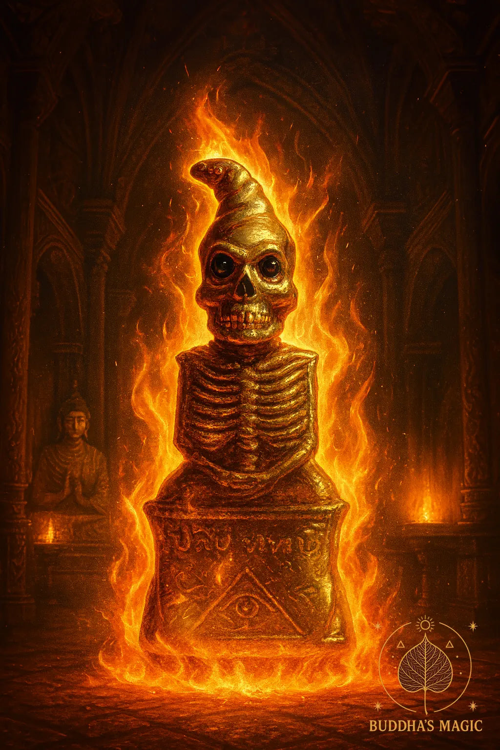 Ici, l'esthétique osseuse amplifie les travaux liés à la rupture karmique, à la libération des charges anciennes et à la maîtrise des énergies subtiles. Les yeux bleu marine, extrêmement rares dans la tradition Phra Ngang, apportent une signature énergétique plus froide, plus profonde, une vibration davantage axée sur l'absorption et la transmutation que sur l’agression.