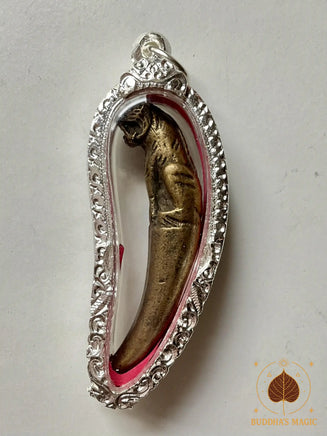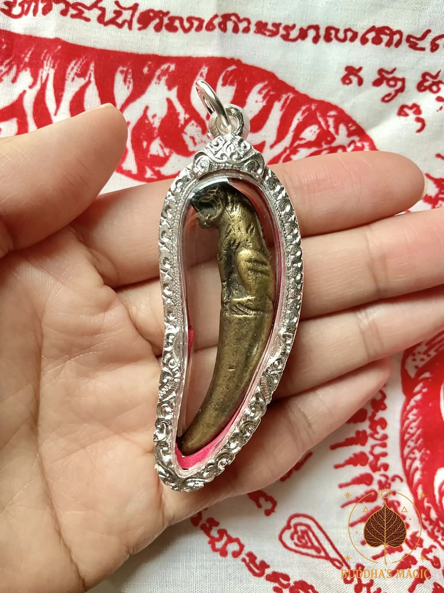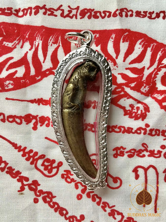La consécration au Wat Bang Phra, temple mondialement reconnu pour ses rites liés aux sak-yant et aux esprits animaux, confère à ce pendentif une énergie spirituelle intense et authentique, fidèle aux pratiques transmises par Luang Phor Pern.