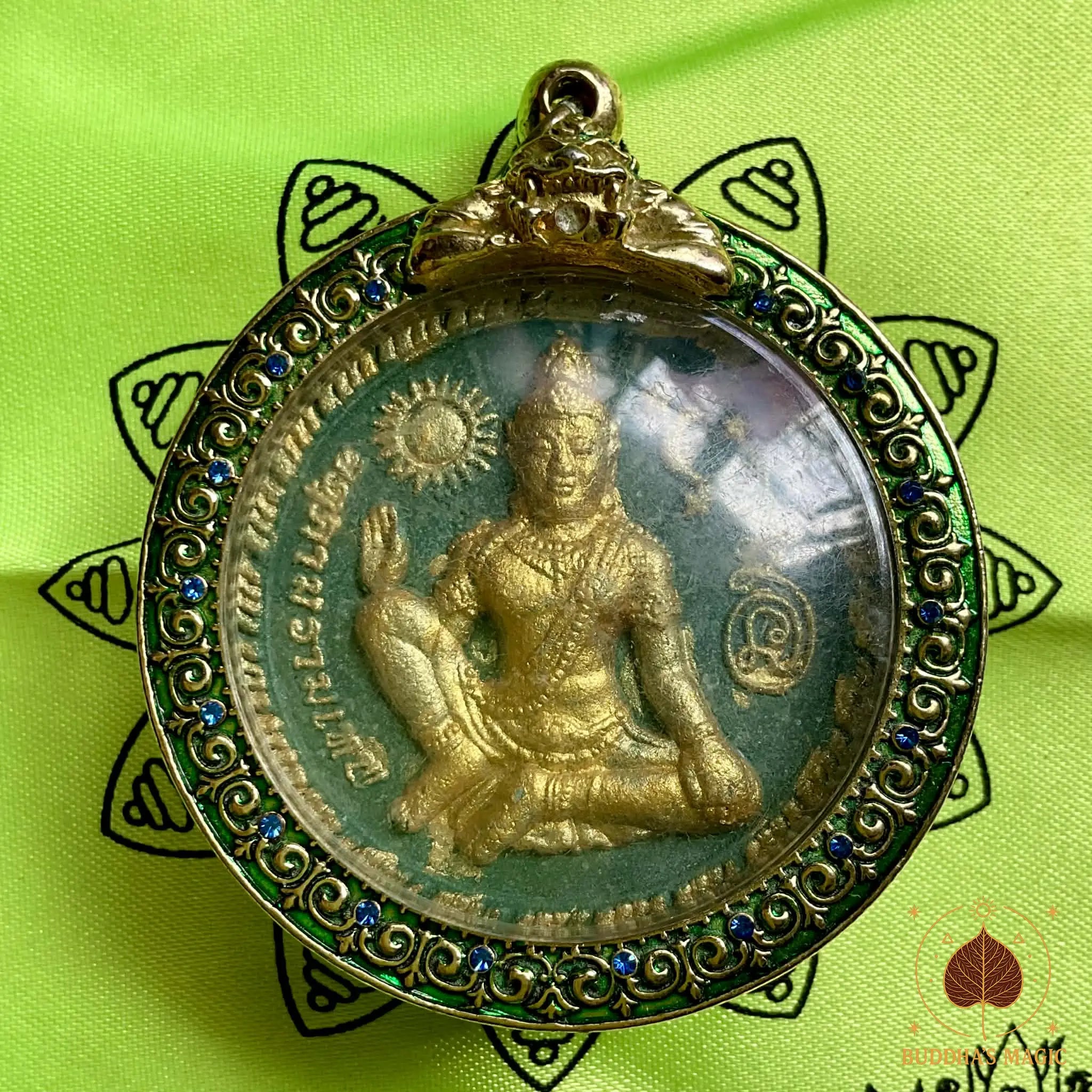 Cette grande amulette de Jatukham Rammathep, issue de la série Roon Sap Raja (le Roi des richesses), a été consacrée en 2007 au célèbre Wat Phra Mahatat Woramahawihan, dans la province de Nakhon Sri Thammarat.