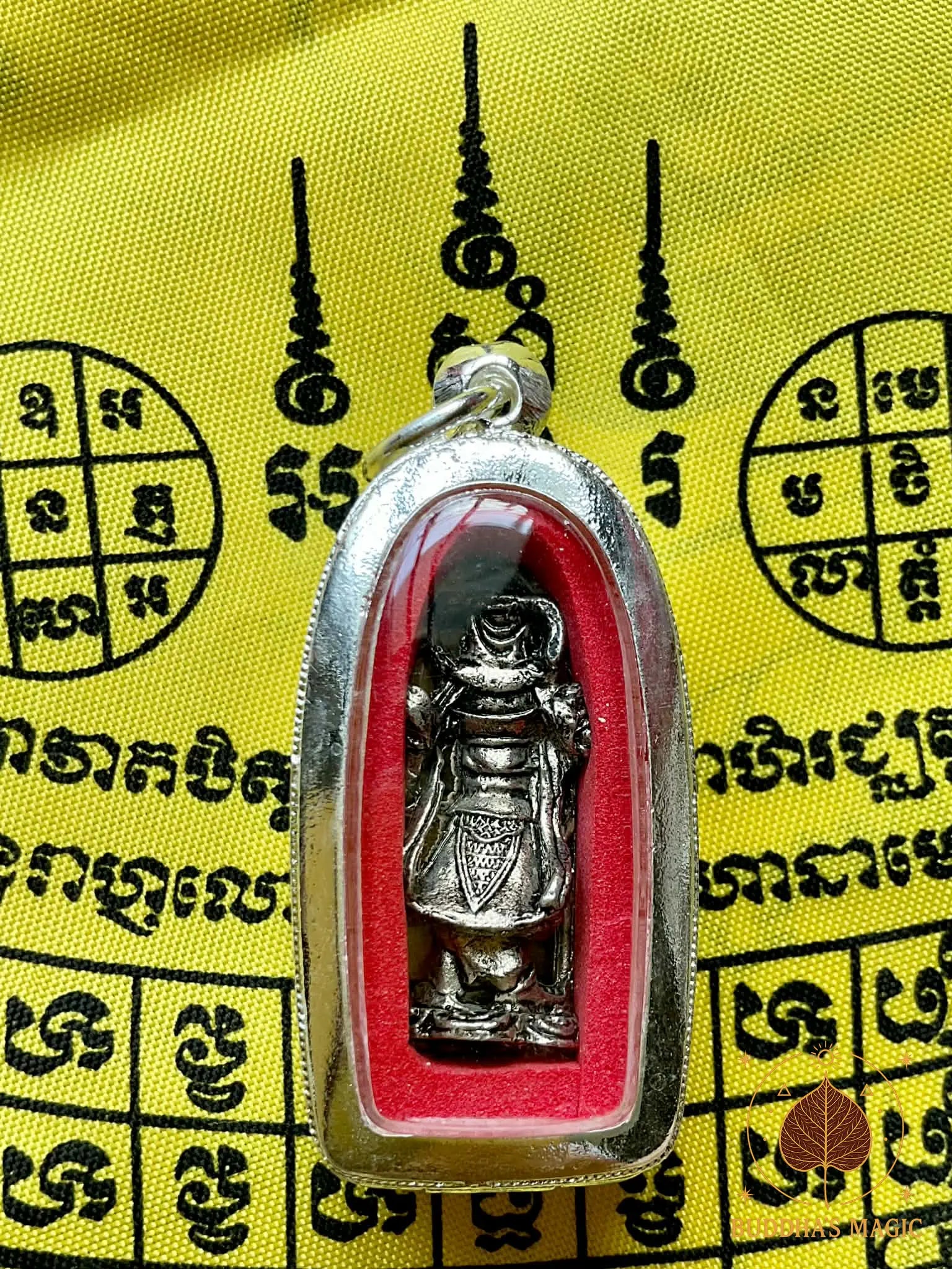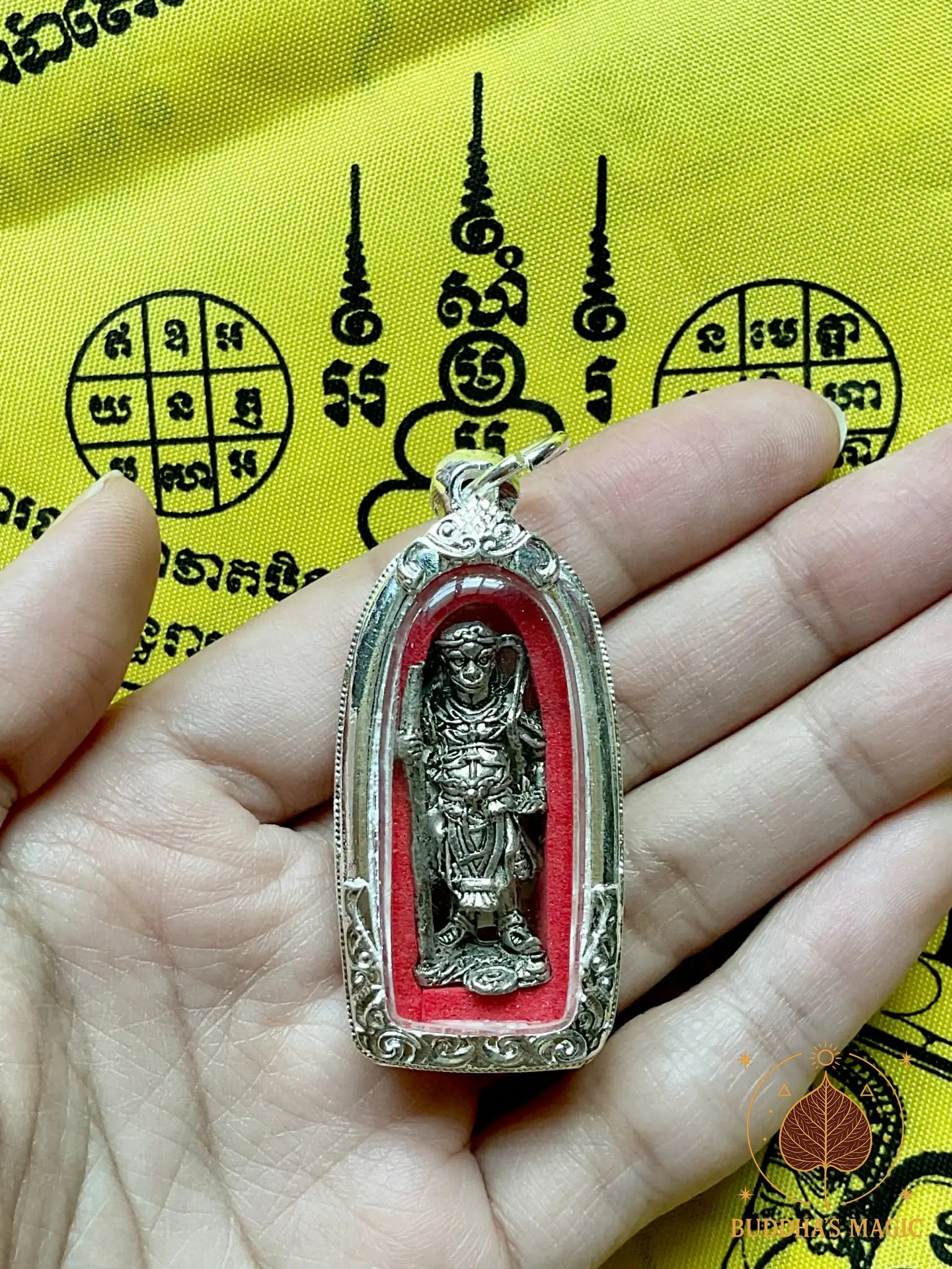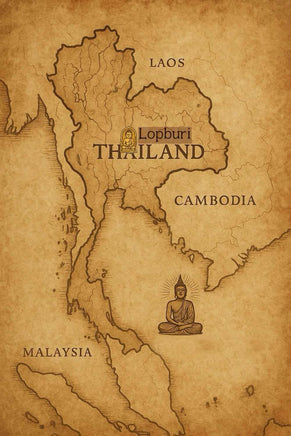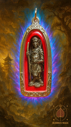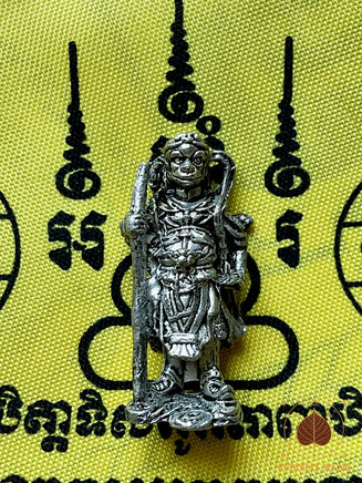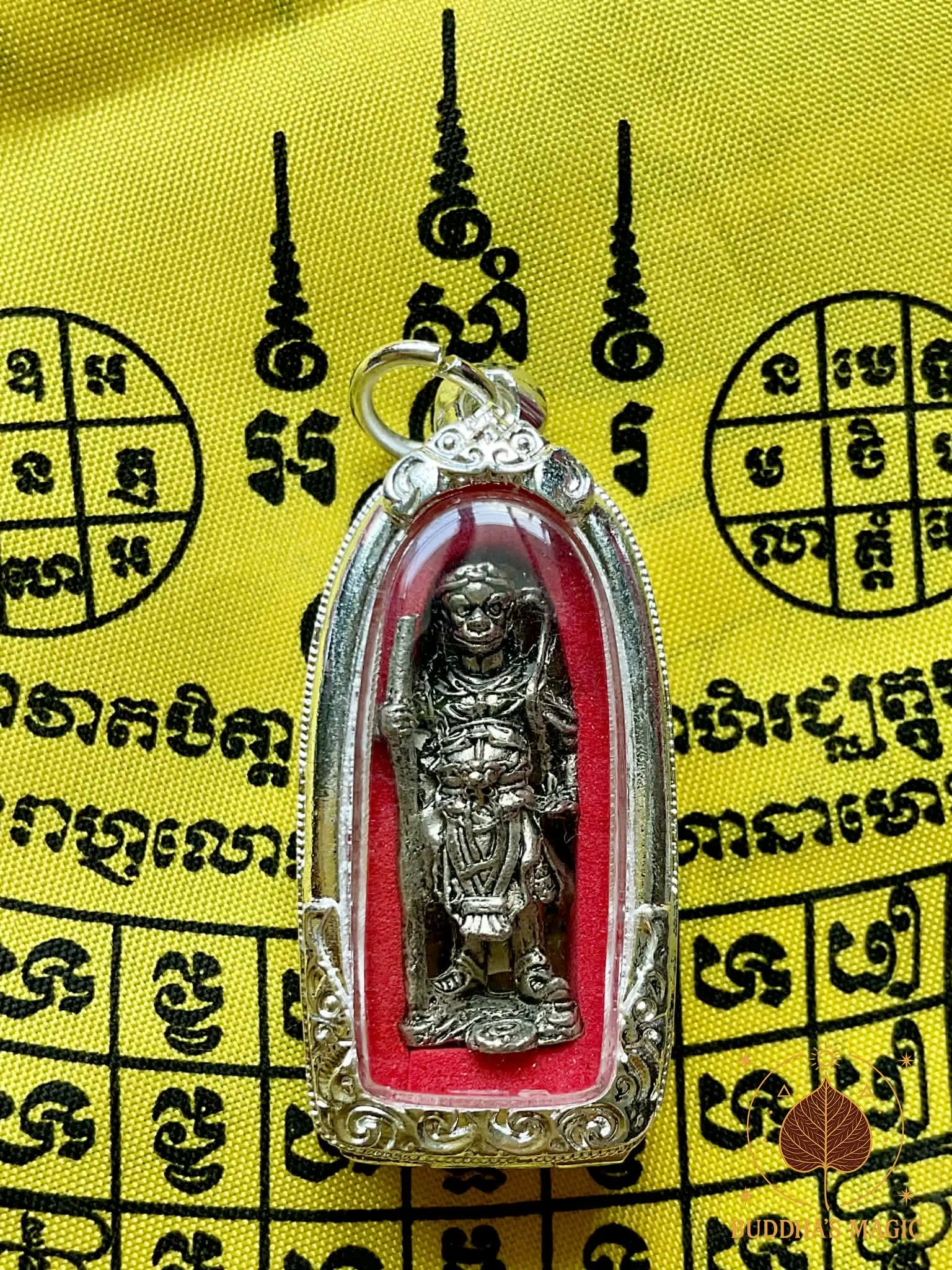 Cette amulette exceptionnelle représente Sun Wukong, le légendaire Roi des Singes, dans sa forme sacrée Roon Sathan Traiphop, littéralement « celui qui ébranle les trois mondes ». Elle fut consacrée en 2004 lors d’une grande cérémonie rituelle au temple hindouiste de San Phra Kan, à Lopburi, cité sacrée des singes et lieu ancien dédié aux divinités protectrices et aux forces héroïques.