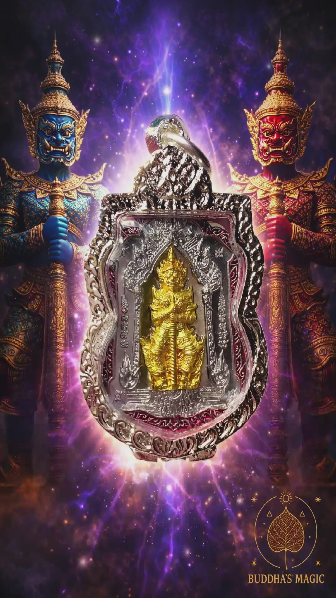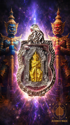 Cette puissante médaille représente Tao Wessuwan, grand démon gardien et roi des Yaksha, protecteur redouté et vénéré dans le bouddhisme thaïlandais. Il est reconnu pour son autorité spirituelle, sa capacité à repousser les influences négatives et à protéger les lieux, les biens et les personnes.