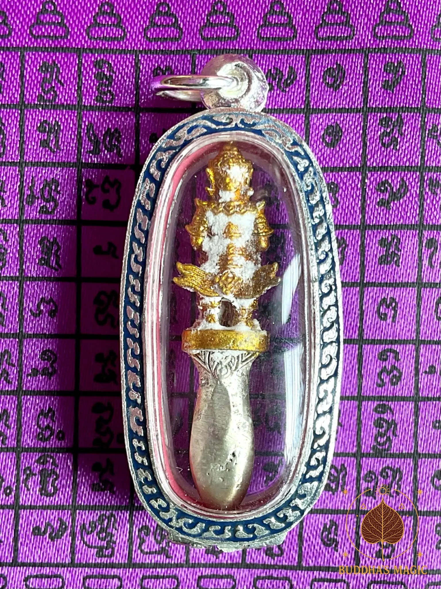 Cette amulette est réalisée en métal doré et argenté. Avec le temps, de magnifiques cristaux phratat blancs sont apparus naturellement sur sa surface, phénomène traditionnellement interprété comme un signe de grande bénédiction et de charge spirituelle élevée.