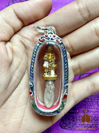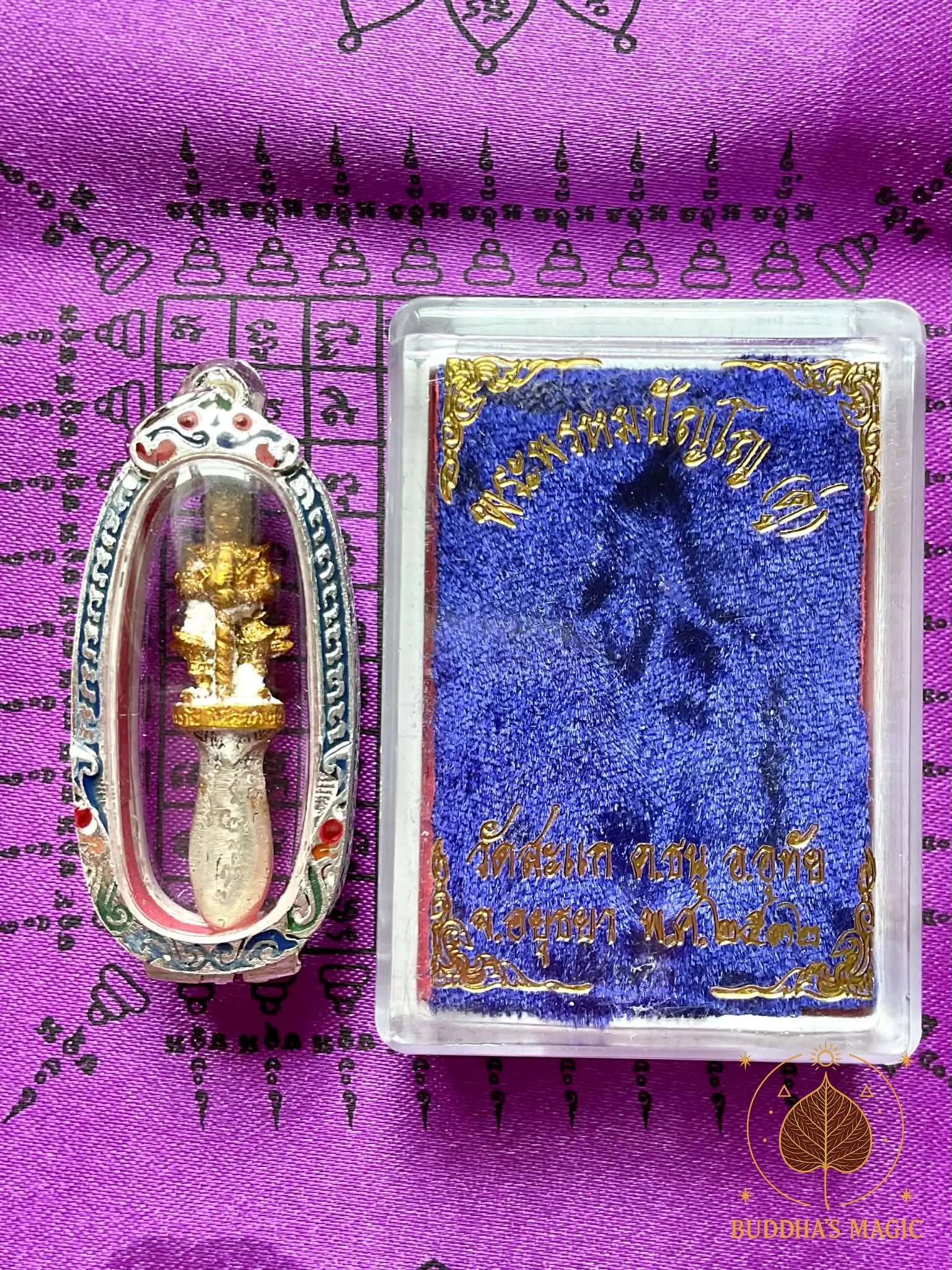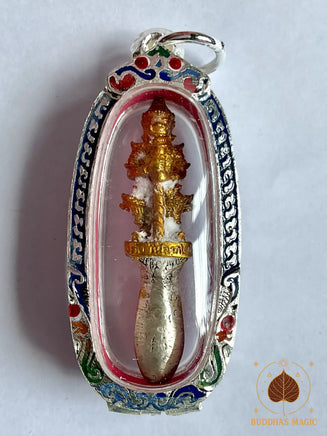 Cette petite amulette dague rituelle Phra Karn Tao Wessuwan est une pièce rare et profondément symbolique, consacrée par le très vénérable Luang Phor Dooh du Wat Sakai, à Ayutthaya.