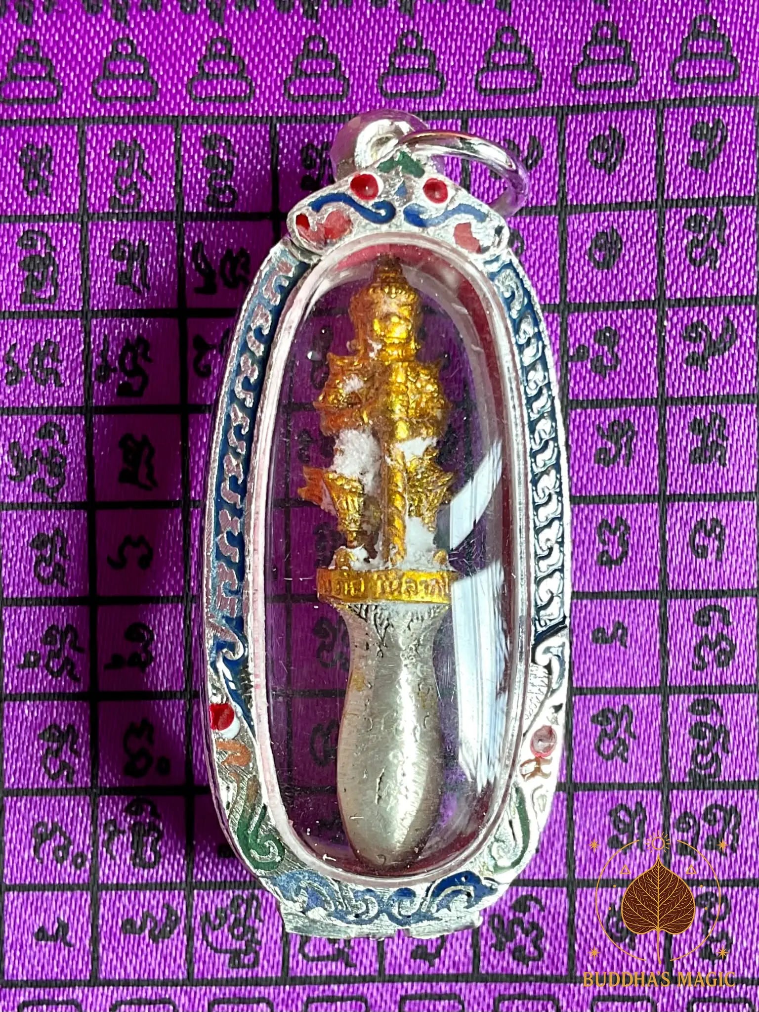 Le Phra Karn est une dague rituelle sacrée, associée au puissant démon gardien Tao Wessuwan. Elle symbolise l’autorité, la protection absolue et la capacité à trancher net les influences négatives, la magie nuisible et les énergies hostiles.