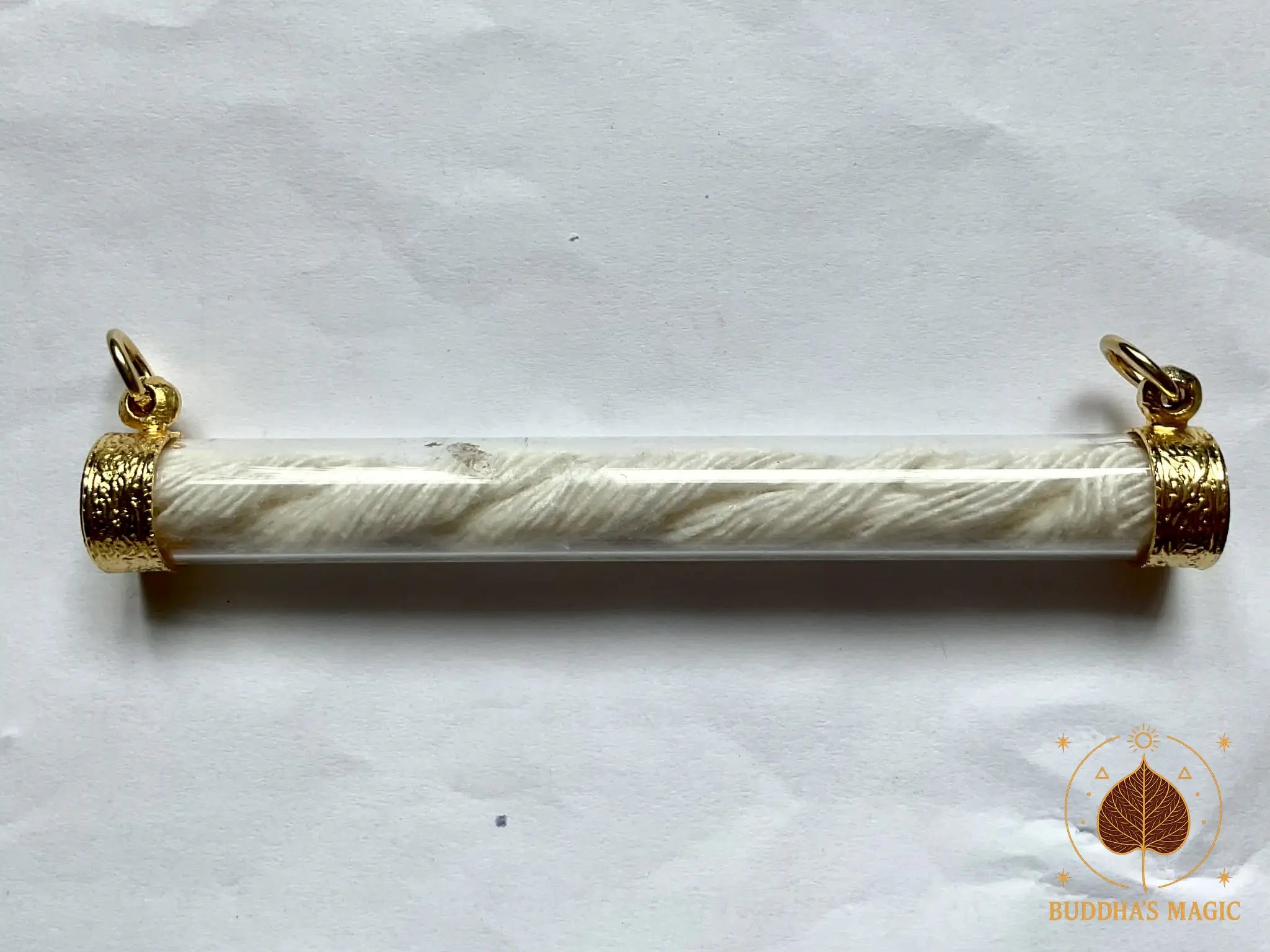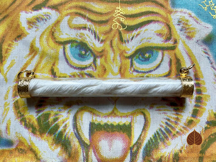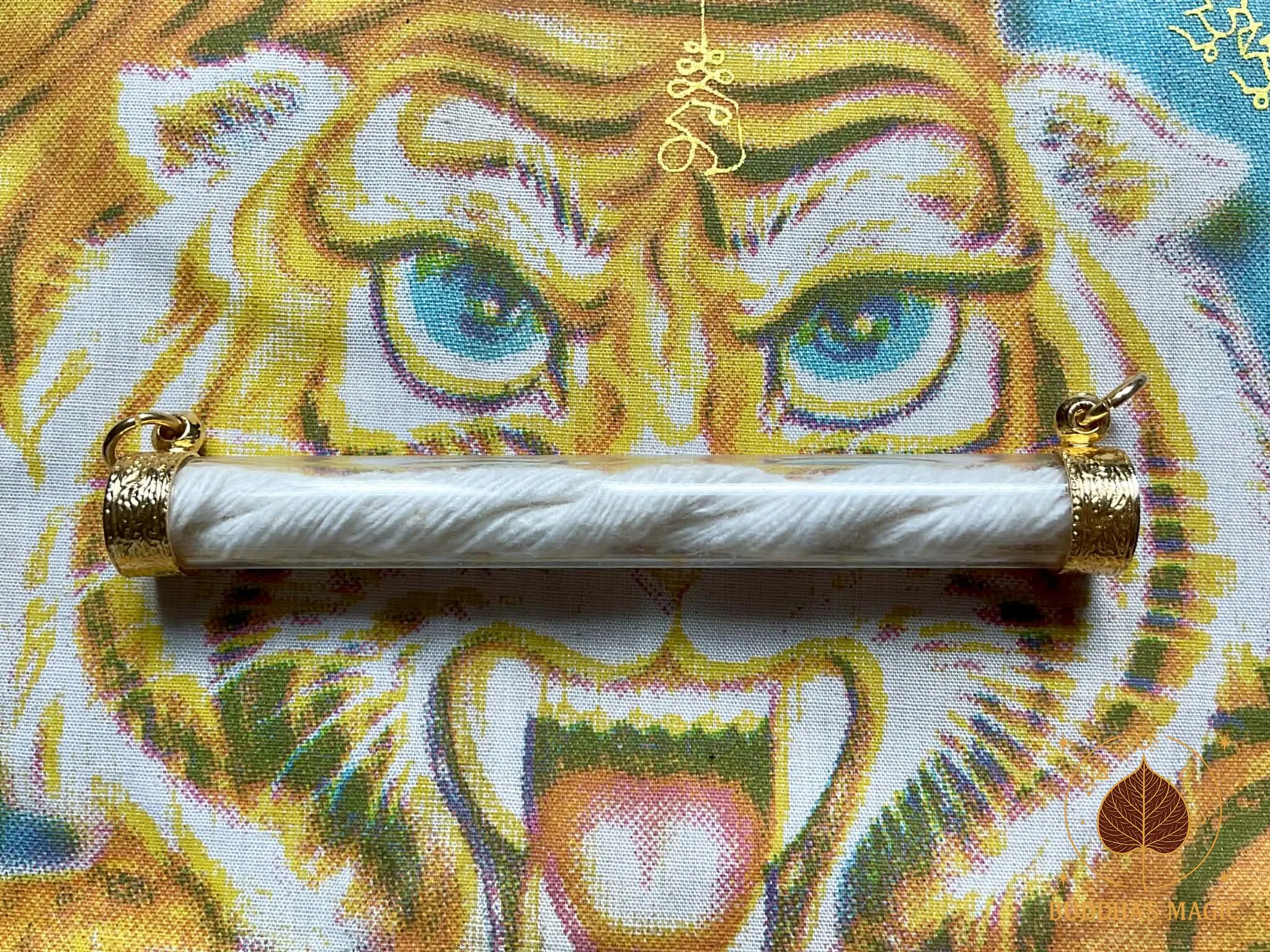 Le Pa Yant est présenté avec un reliquaire doré richement orné, contenant un véritable morceau de fil Sai Sin blanc ayant reçu une bénédiction de Luang Phor Pern. Un objet rituel d’une force particulière, idéal pour ceux qui recherchent protection, pouvoir personnel et avancée sur le chemin des affaires et du leadership.