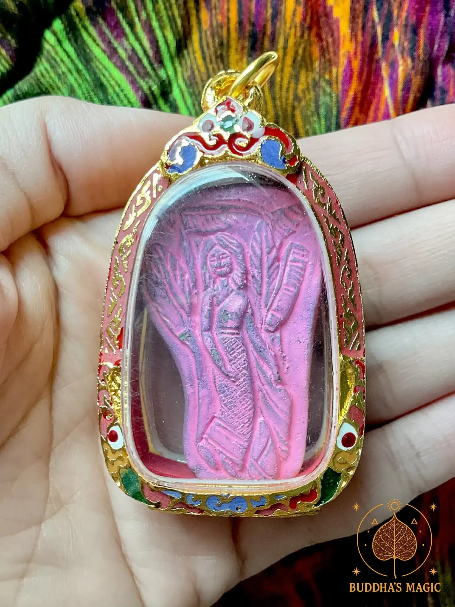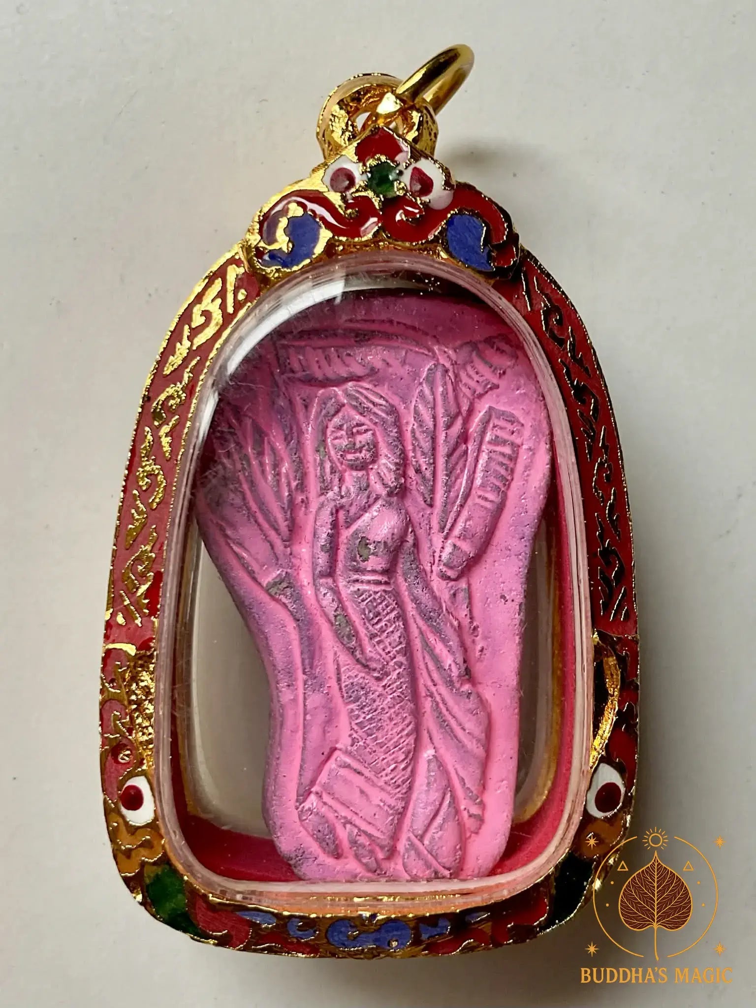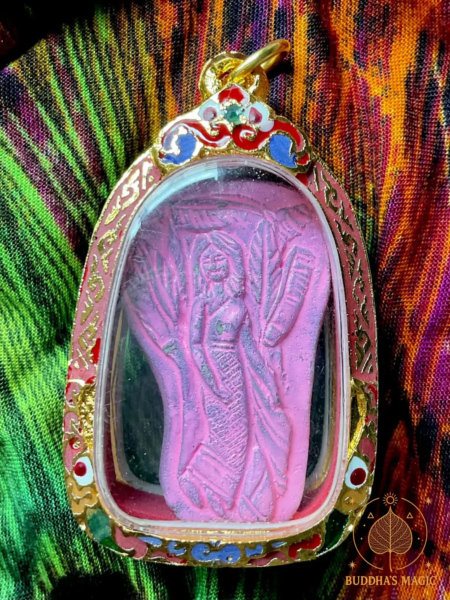 Cette amulette de Mae Nang Tanee a été créée selon un rituel traditionnel ancien par le Vénérable Luang Pu Wiang du Wat Sawang Nong Chat, dans la province de Maha Sarakham. Elle est imprégnée de l’énergie bienveillante de Nang Tanee, esprit féminin protecteur lié au bananier sacré, symbole de fertilité, de prospérité et de charme.