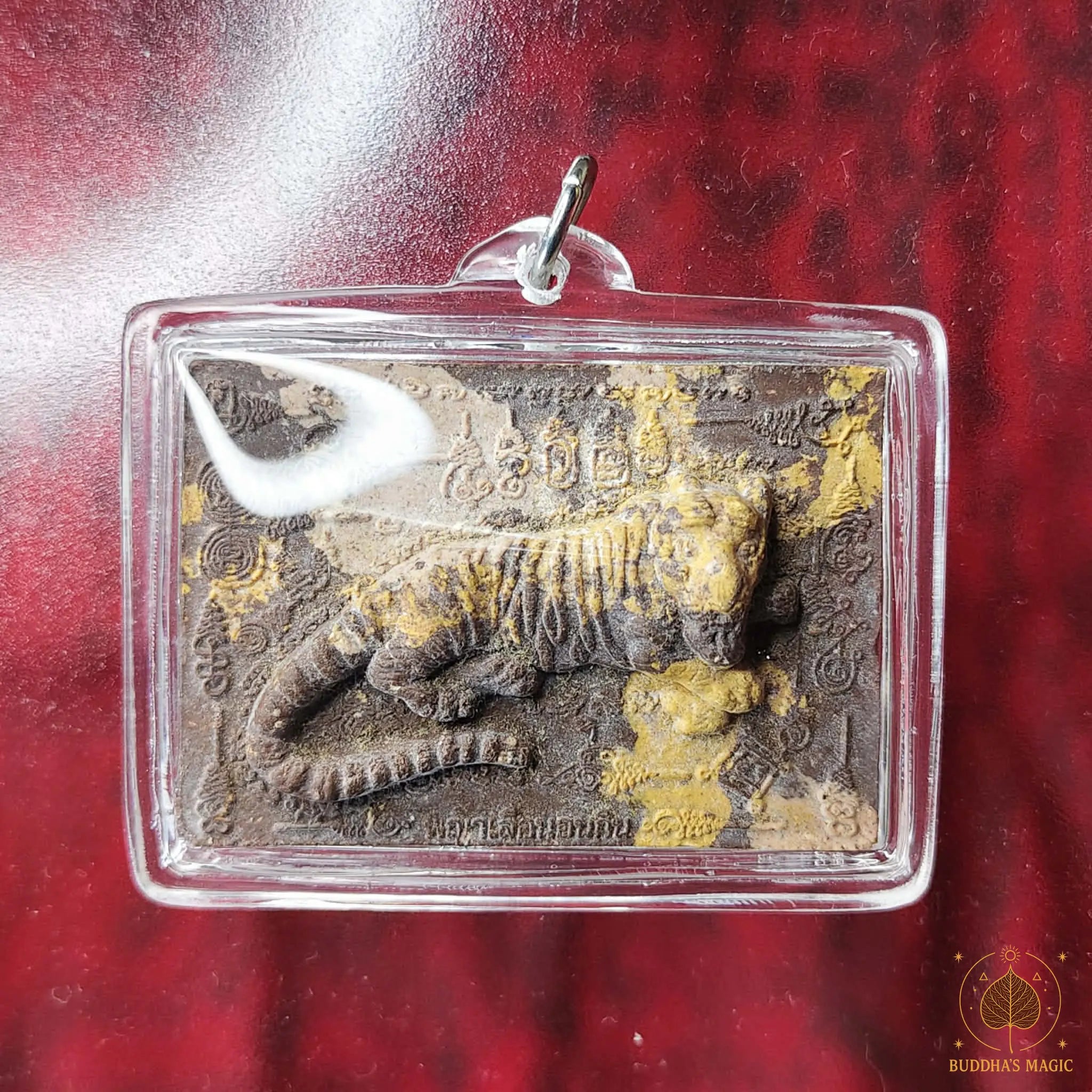 Dans la tradition des amulettes animales de Thaïlande, le tigre sacré est souvent associé à la protection contre les dangers, à l’affirmation de la volonté et à la capacité de tenir sa place face aux obstacles. Cette pièce dégage une présence ancienne et rituelle, renforcée par son aspect sobre, sa patine et sa représentation en relief du tigre protecteur.