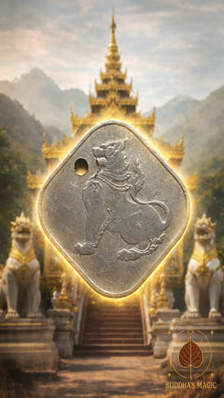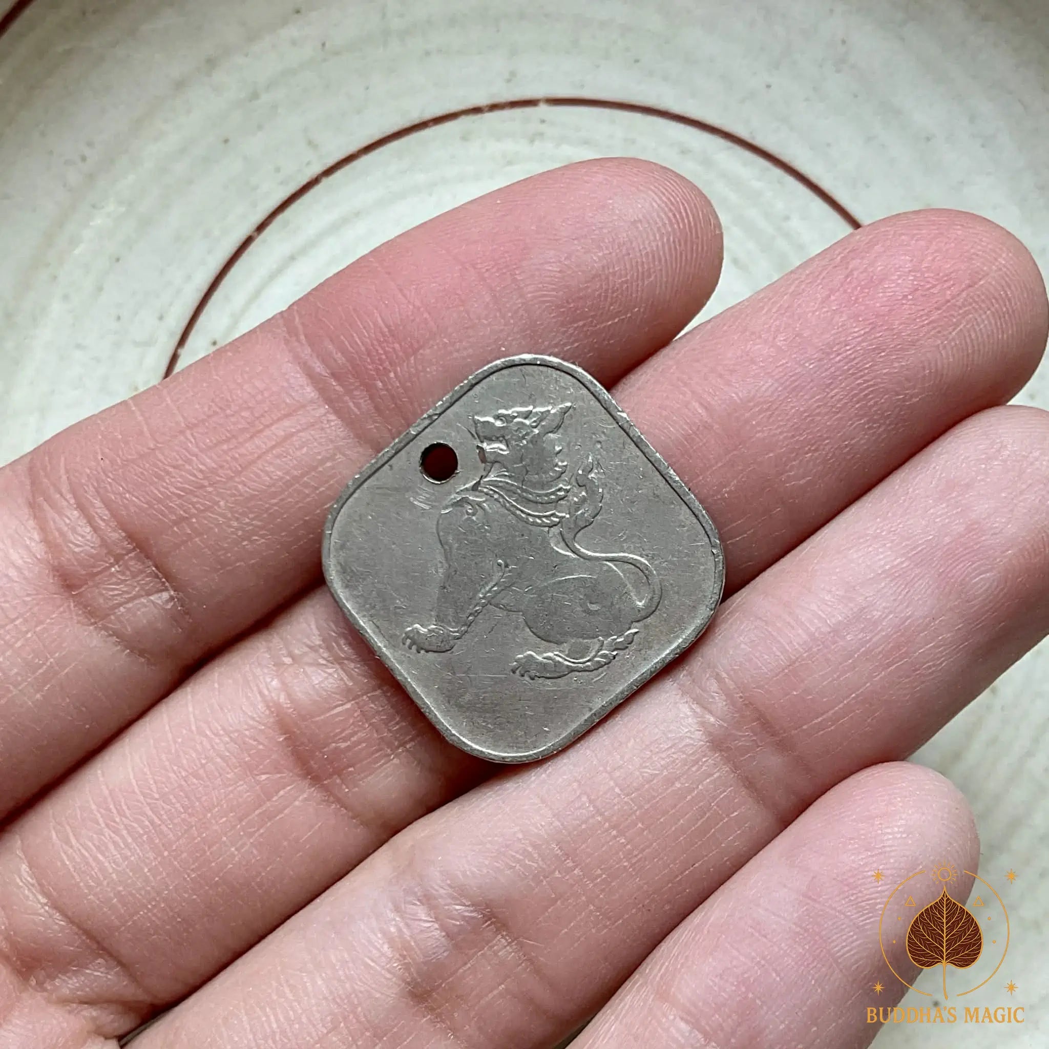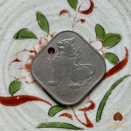 Pièce ancienne carrée de 10 Pyas du Myanmar (Birmanie), frappée dans les années 1940–1950, représentant le Chinthe, lion mythique gardien des temples birmans.