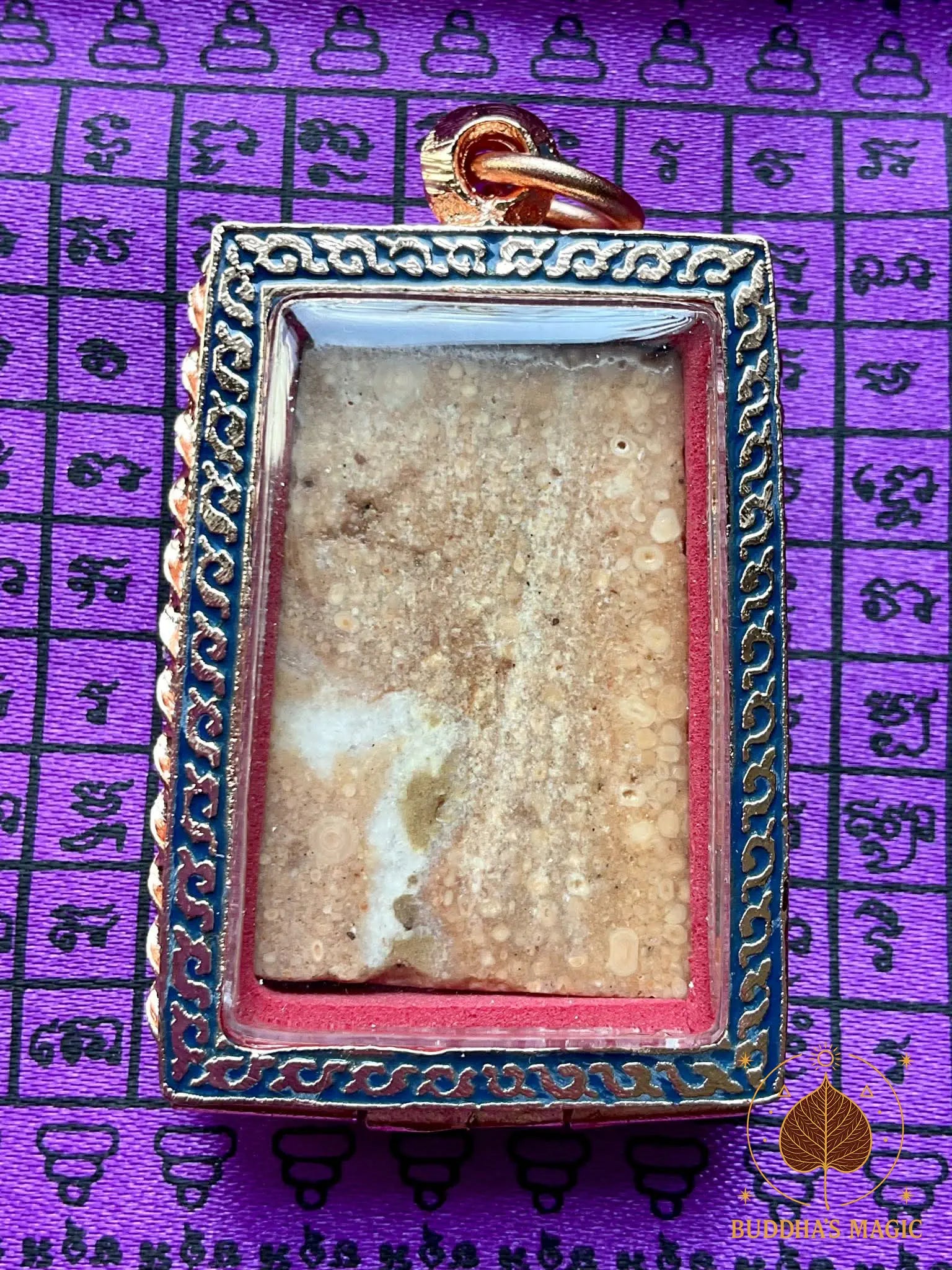 Cette amulette est taillée dans de la pierre relique Hin Phratat et représente un Bouddha de type Phra Somdej, assis en méditation sur plusieurs degrés symbolisant les niveaux d’élévation spirituelle. Cette amulette classique incarne la sagesse, la protection et la stabilité intérieure.