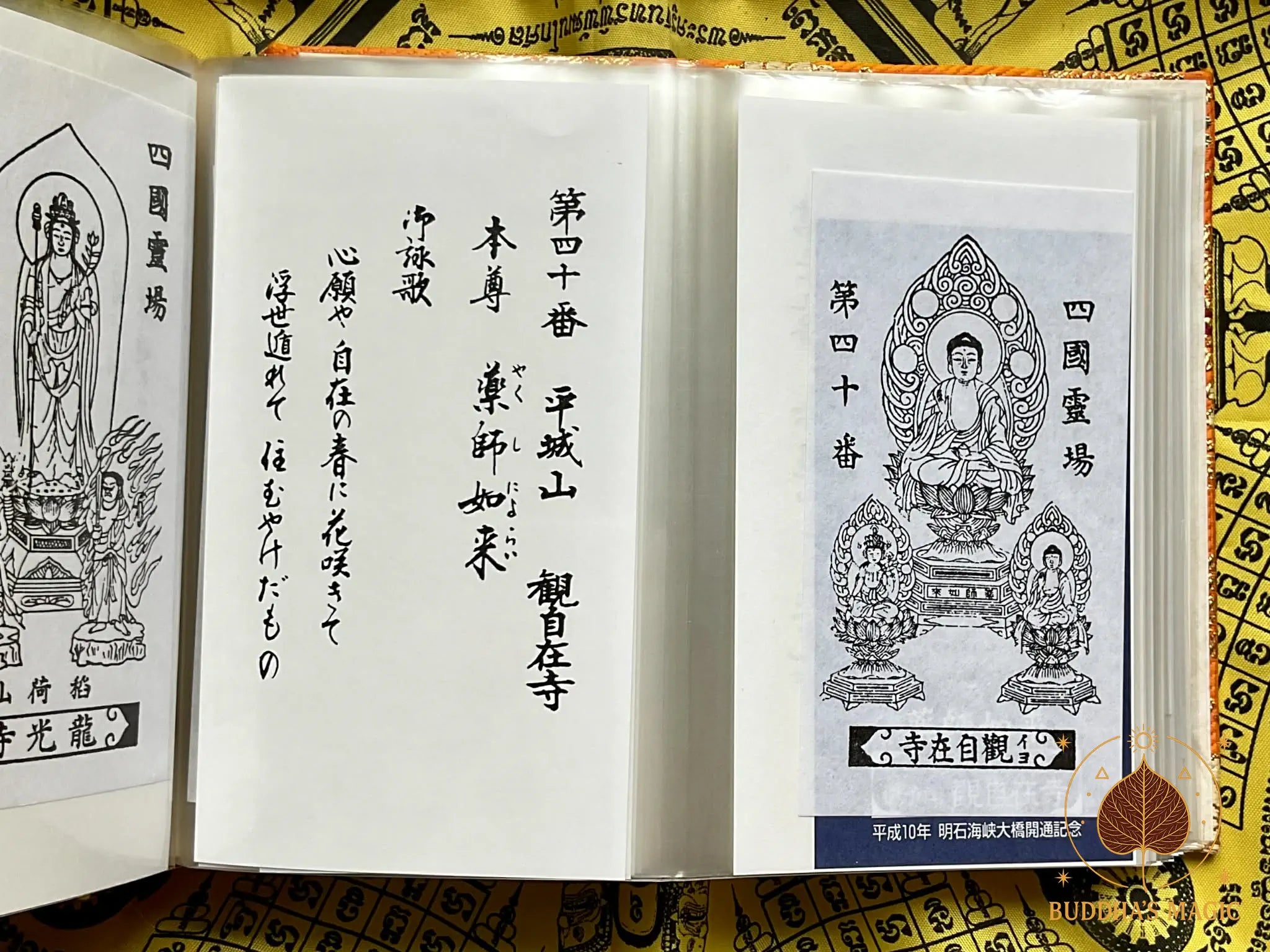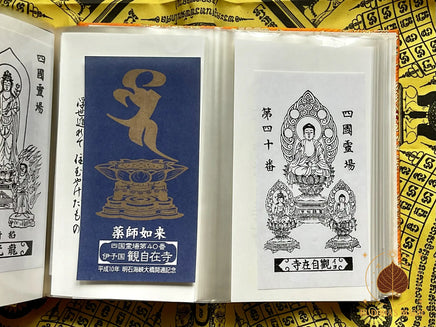 Chaque page présente des images bouddhiques, calligraphies et tampons, parfois en noir et blanc, mais plusieurs entrées rares sont également visibles en version bleue ou argent, comportant la lettre germe (bīja) du Bouddha associé au temple. Un bien bel objet spirituel à conserver, exposer ou placer sur ton autel Shingon, Tendai ou dédié à Guan Yin pour la dévotion ou comme pièce de collection historique.