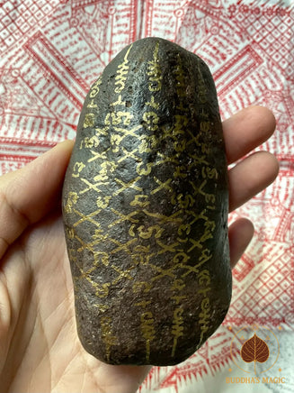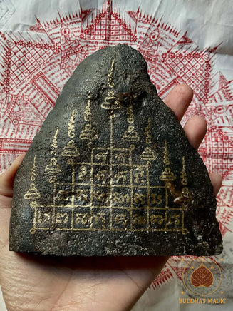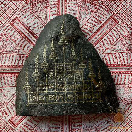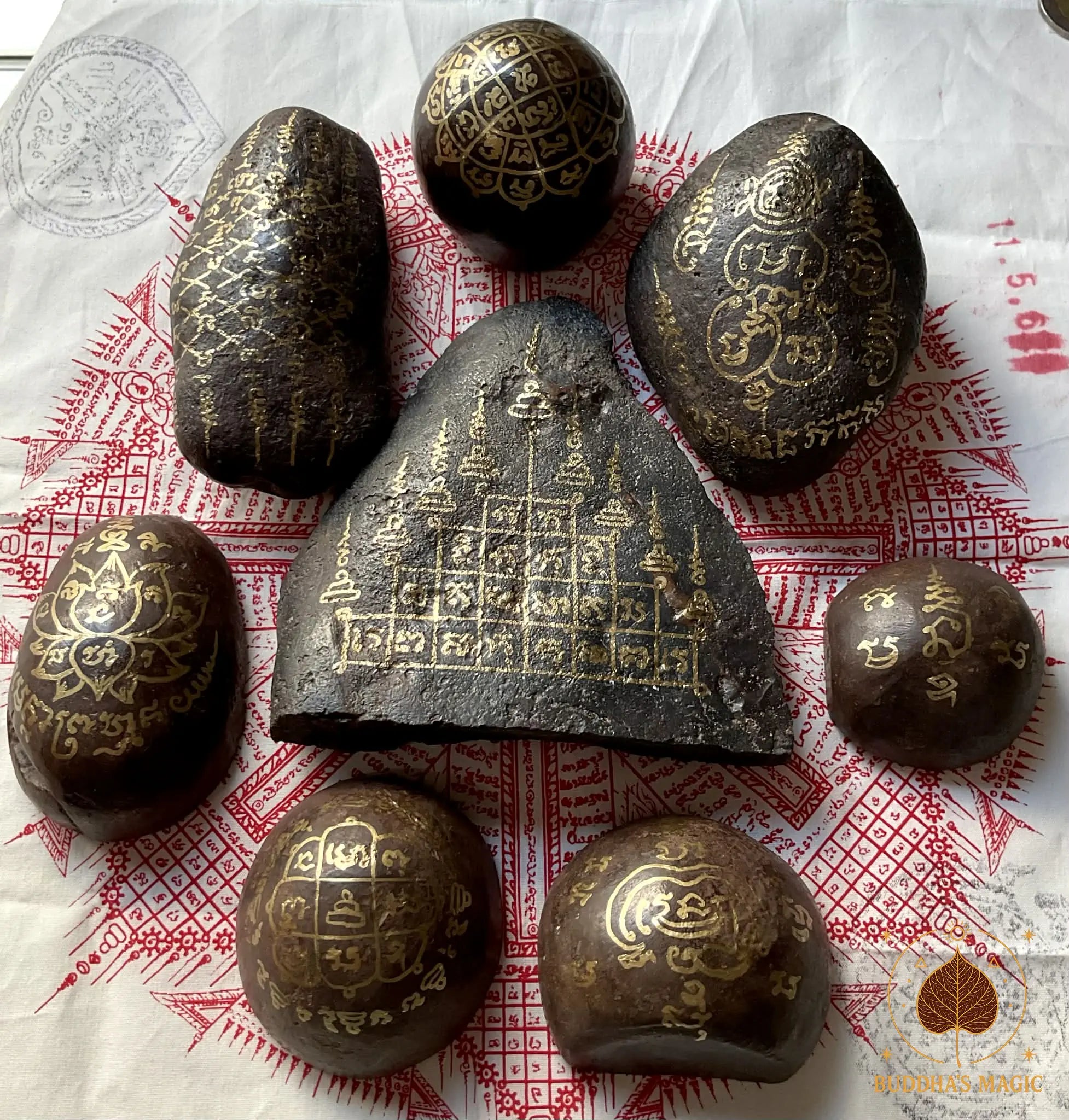 Voici de grandes pépites authentiques de Lek Namphi, le légendaire « fer bleu magique », consacrées et décorées de yant dorés par un Ajarn de la lignée traditionnelle du Wat Namphi (Uttaradit), le lieu sacré d’origine de ce matériau mythique.
