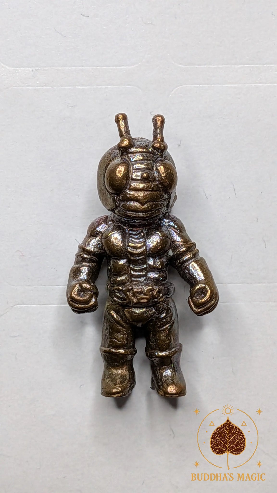 Le personnage représenté adopte volontairement une esthétique inspirée des super-héros japonais des années 70, rappelant l’âge d’or du tokusatsu et des séries cultes de cette époque. Ce choix visuel assumé fait de cette amulette un objet à la fois spirituel et générationnel, destiné aux pratiquants modernes comme aux collectionneurs nostalgiques.