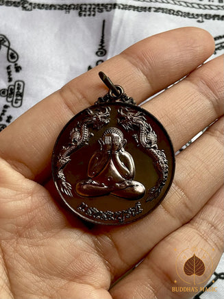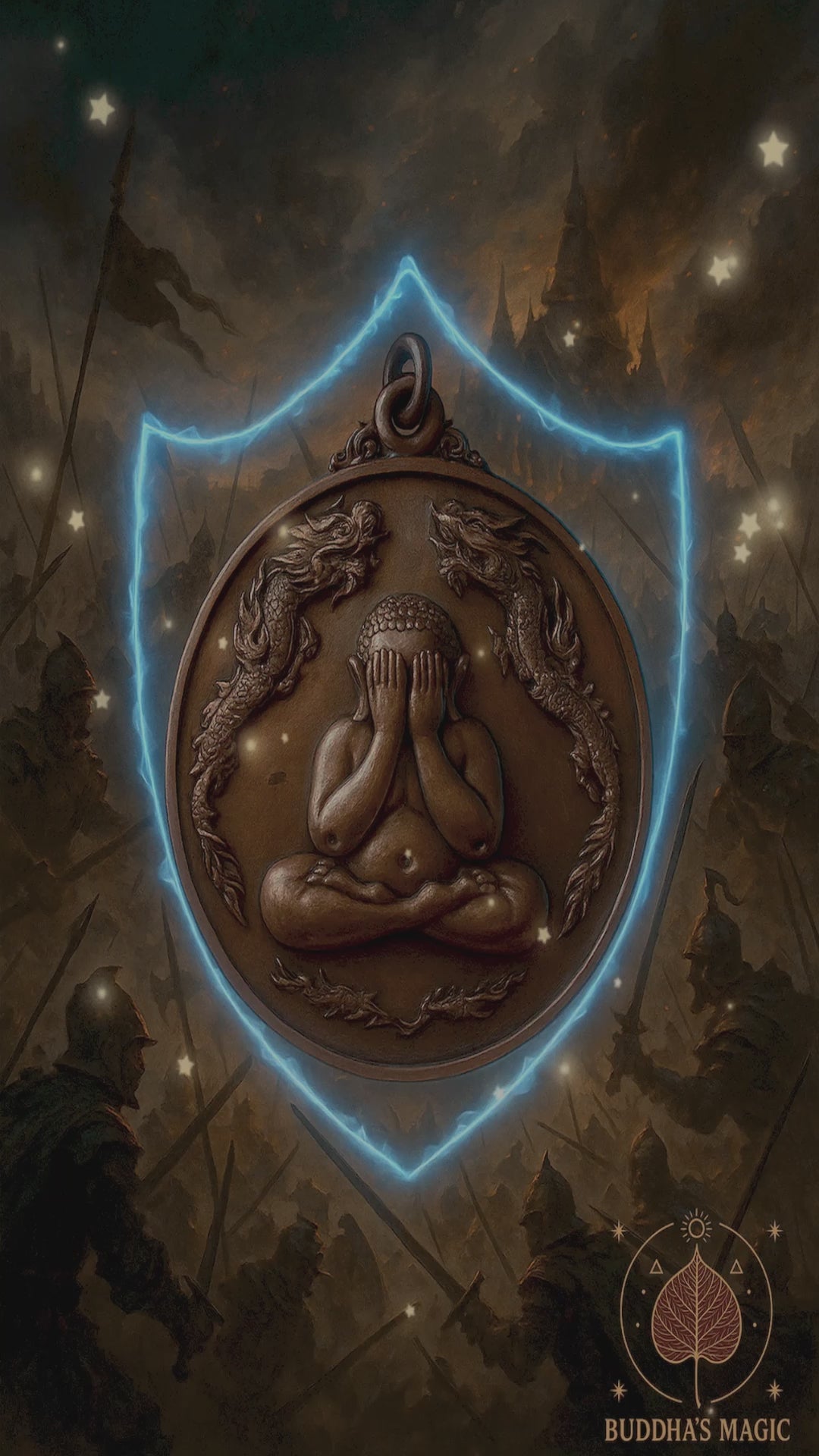 Le Phra Pidta, maître de la fermeture des sens, est ici magnifié par deux dragons protecteurs, symboles d’autorité, de vigilance mystique et de force tellurique. Cette configuration double dragon est réputée intensifier la protection contre les attaques visibles et invisibles, la malveillance, la magie hostile et les accidents.