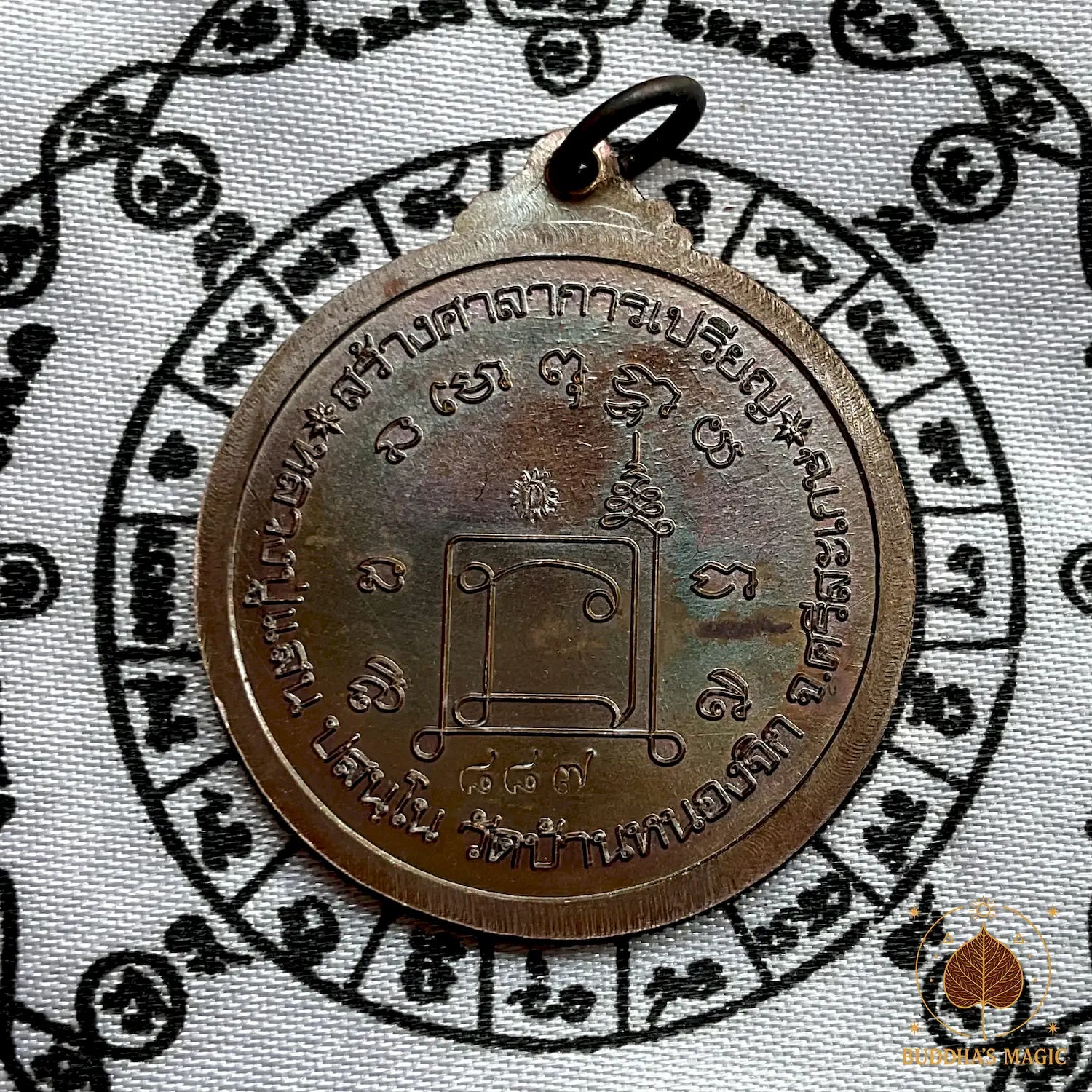 Cette superbe médaille Phra Pidta Double Dragon (pim Saensomboon) fut consacrée en 2018 en série limitée numérotée de 999 pièces par le très vénérable Luang Phor Saen (1907–2019) du Wat Ban Nong Chik dans la province de Sri Saket. Il s’agit d’une puissante amulette d’invulnérabilité dans la lignée directe des objets protecteurs que portaient autrefois les guerriers médiévaux de Thaïlande.