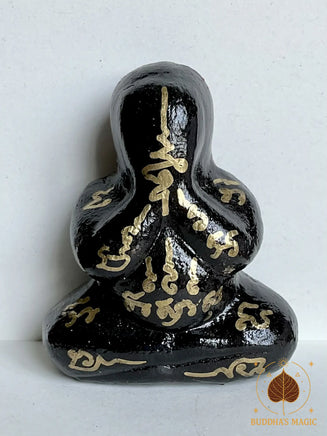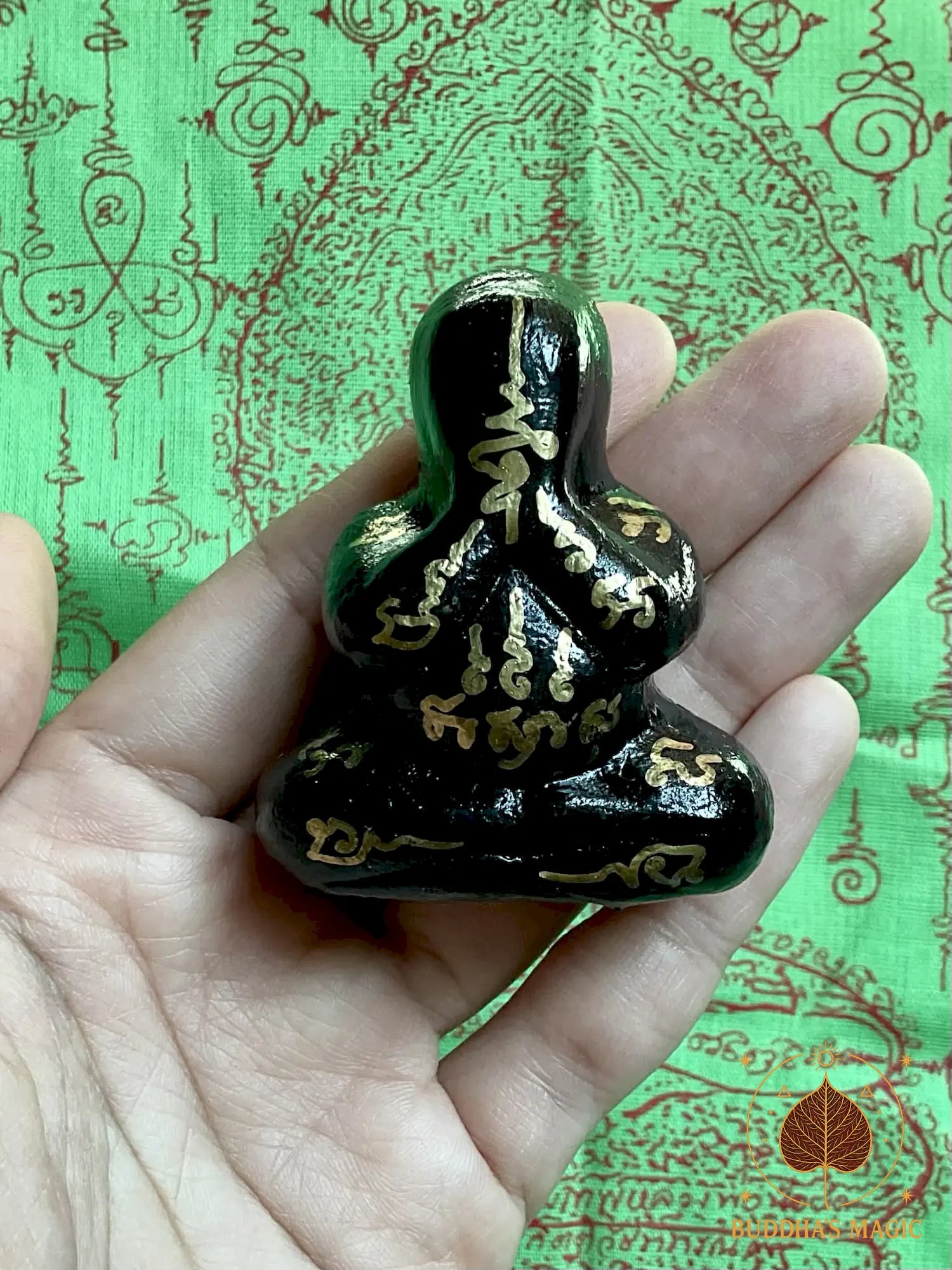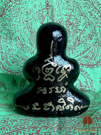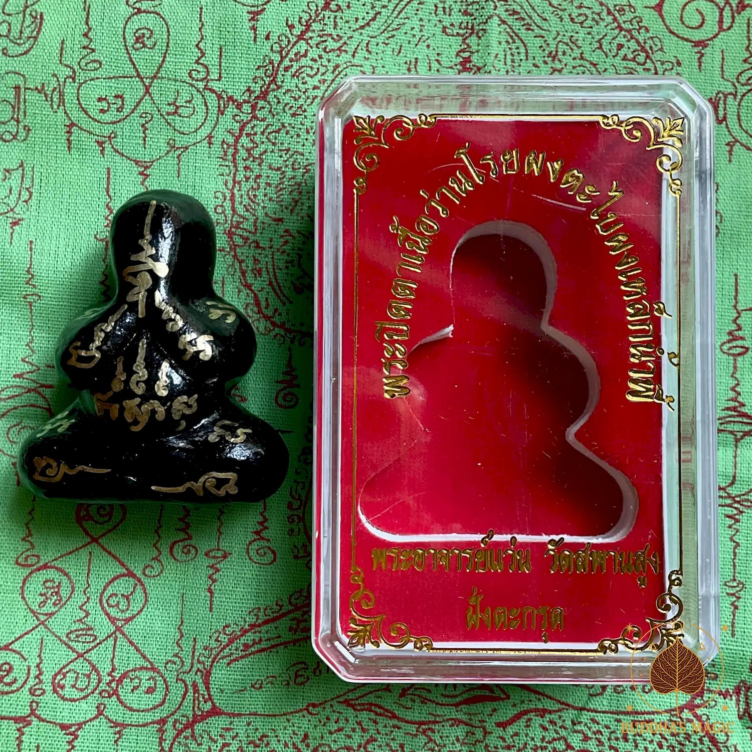 Cette rare statuette Phra Pidta façonnée en neuar wan roe (un mélange de plantes sacrées) avec de la poudre sacrée phong tabai et poudre de minerai de fer magique bleu lek namphi provient du très respecté Phra Ajarn Waen du Wat Saphan Soong, dans la province de Nonthaburi. Elle est entièrement couverte de yant Khom tracés à la main en encre dorée, lui conférant la pleine puissance des bénédictions traditionnelles.