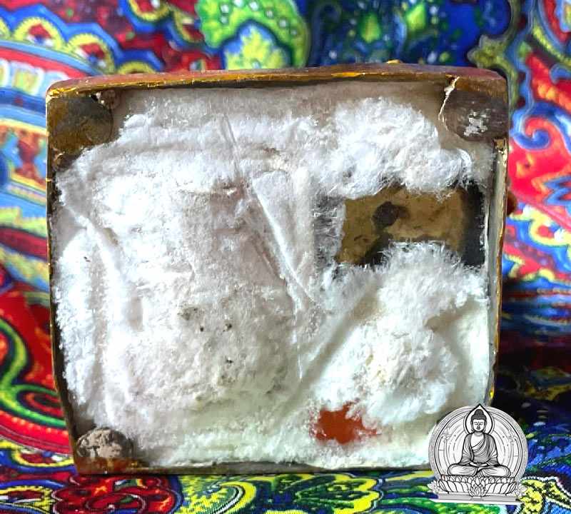 Comme souvent quand il s'agit de statues authentiques du Wat Sakai, la base de cette pièce contient diverses reliques et une amulette de Phra Phrom, qui se sont couvertes de cristaux reliques Phratat blanc avec le temps.