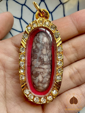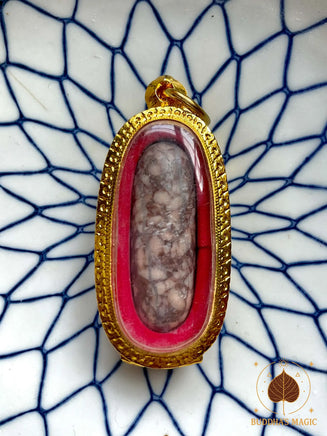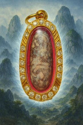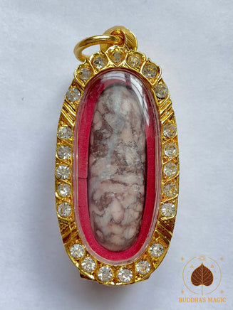 Cette amulette rare renferme un Shiva Lingam façonné dans une pierre relique connue sous le nom de Hin Khao San. Selon une ancienne tradition orale, cette matière sacrée serait issue de grains de riz provenant du bol du Bouddha, qui se seraient multipliés miraculeusement avant de se transformer en pierre au fil du temps.