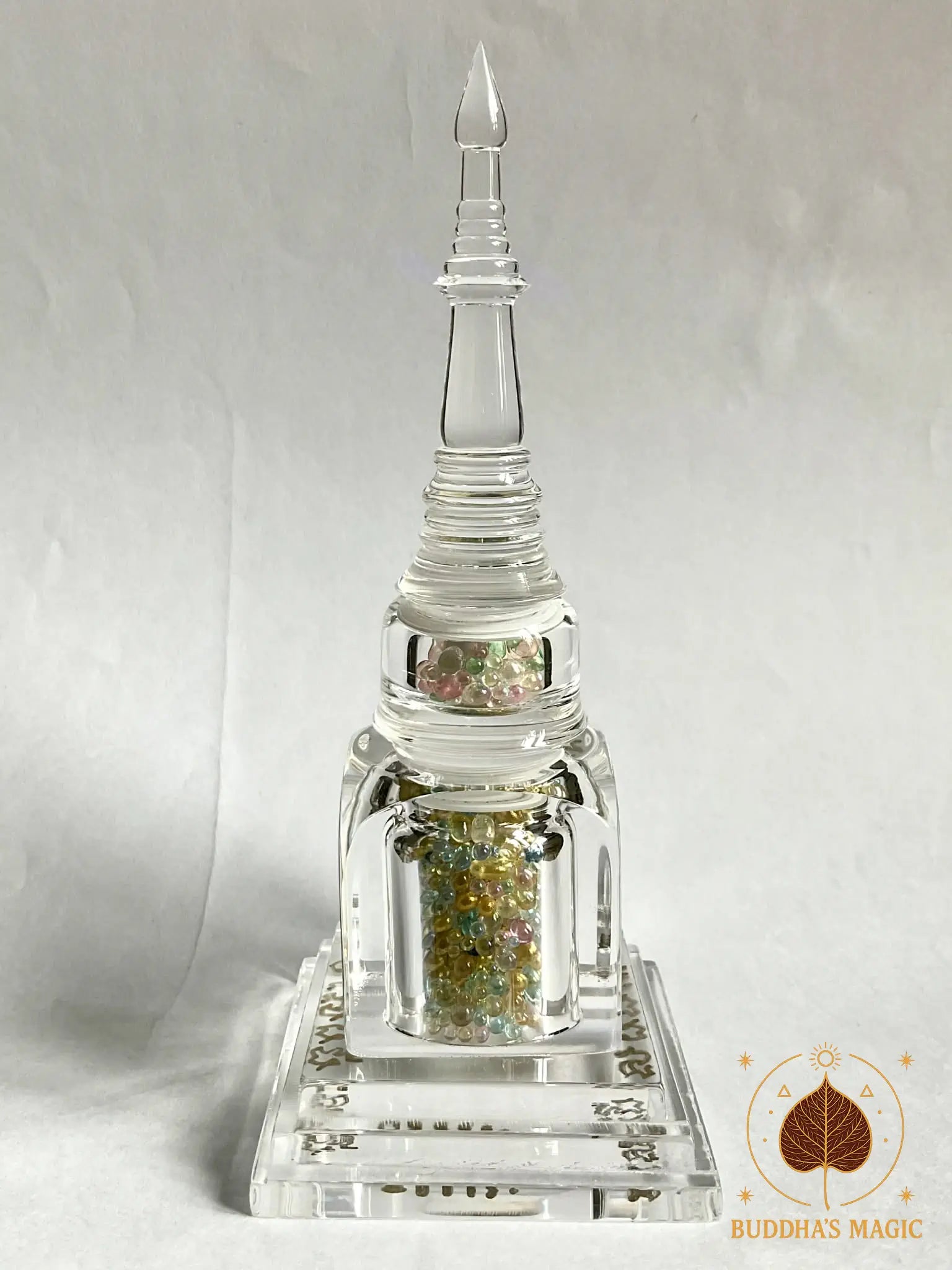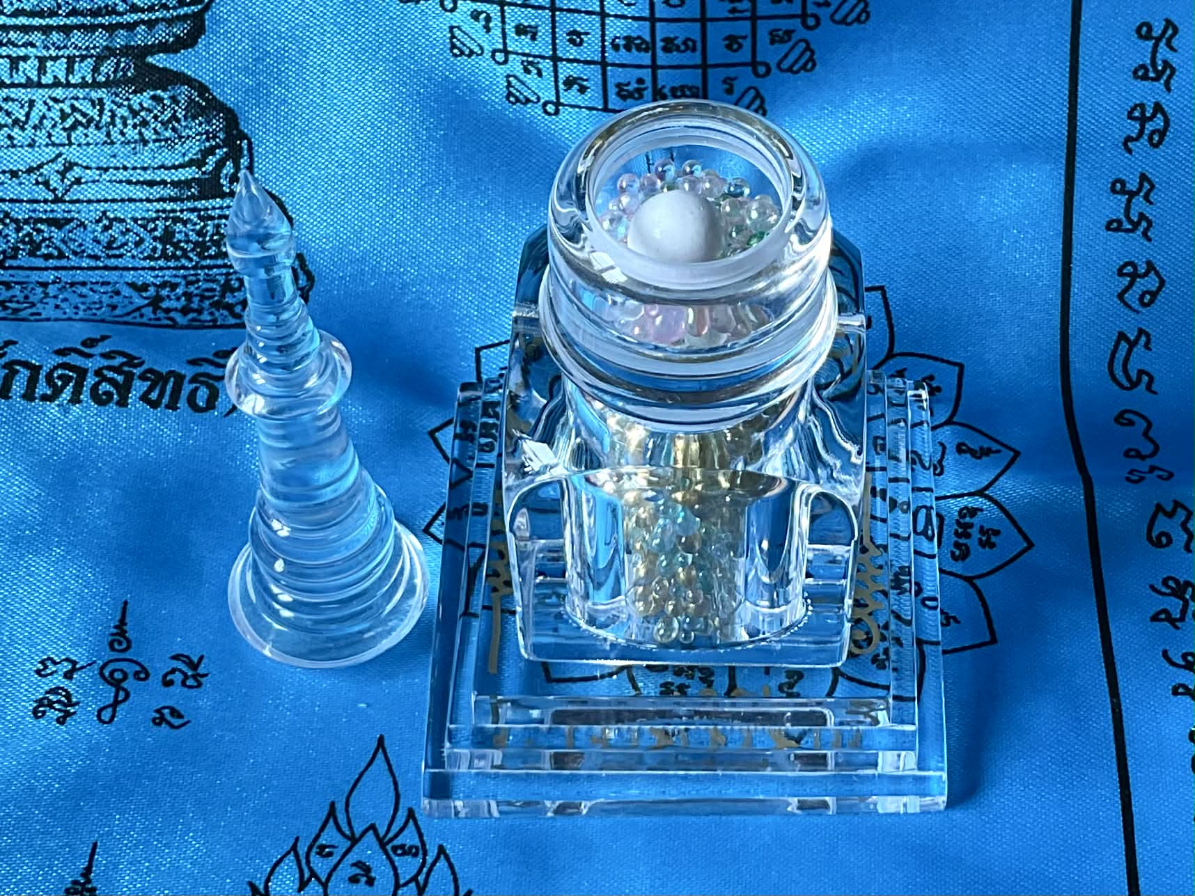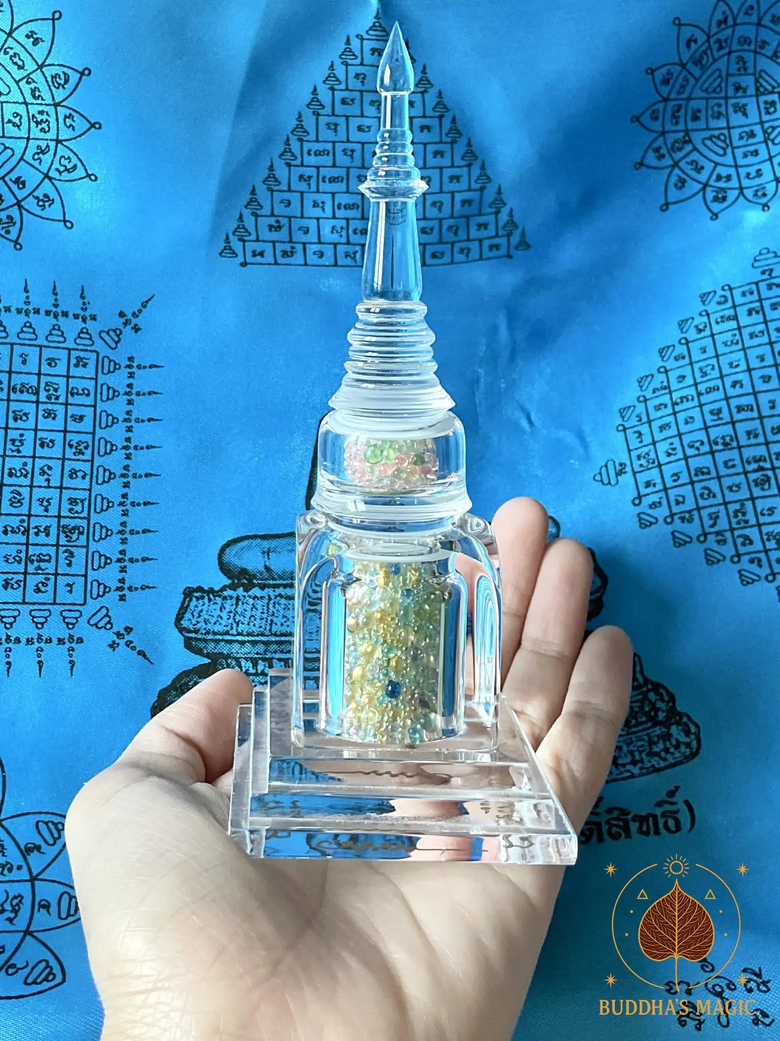 Les Sarira ne sont pas de simples reliques, mais des traces tangibles de la voie accomplie. Leurs couleurs multiples traduisent l’union des vertus, tandis que la bille Jin Gang, blanche et minérale, incarne l’axe immuable de l’éveil. Placé dans ce chedi translucide, l’ensemble agit comme un point d’ancrage spirituel, favorisant la paix intérieure, la protection subtile et la stabilité karmique.