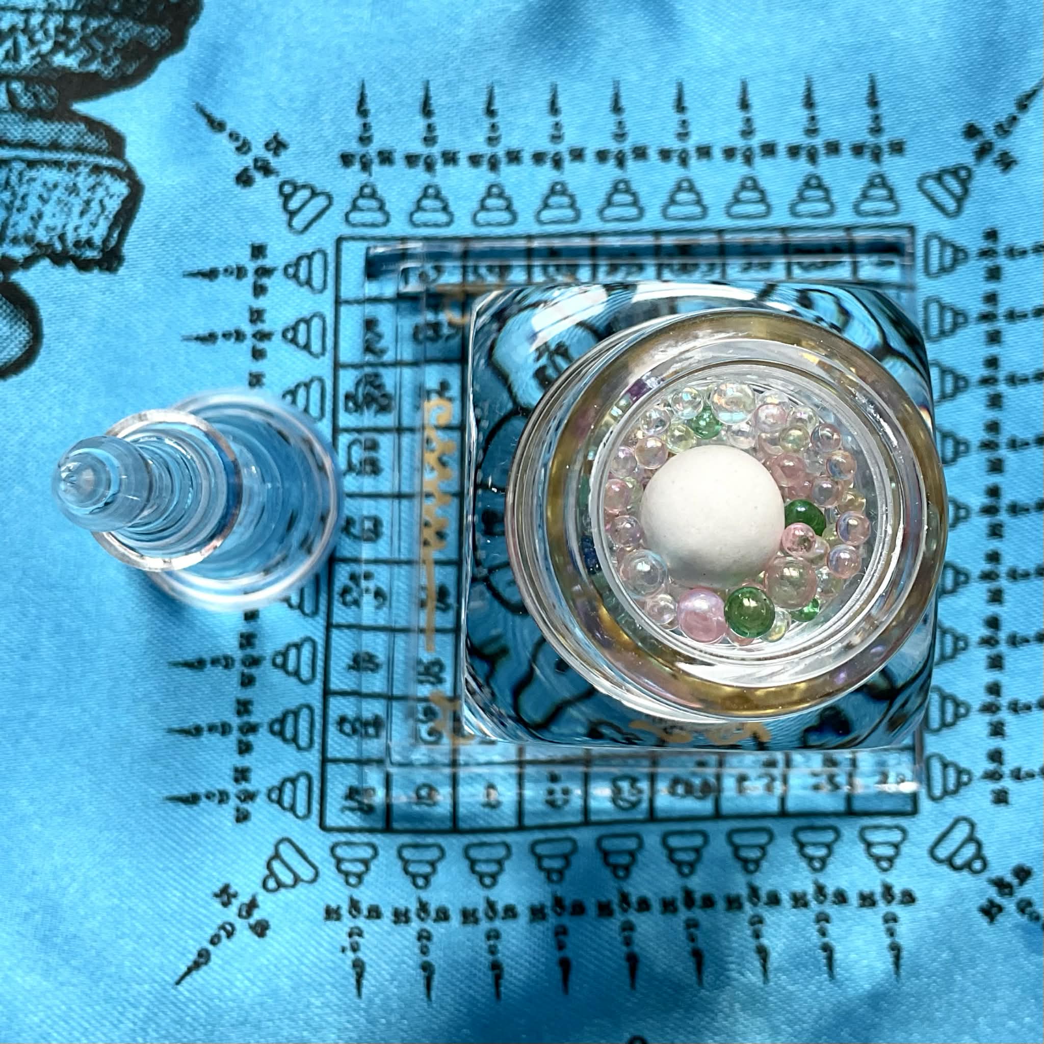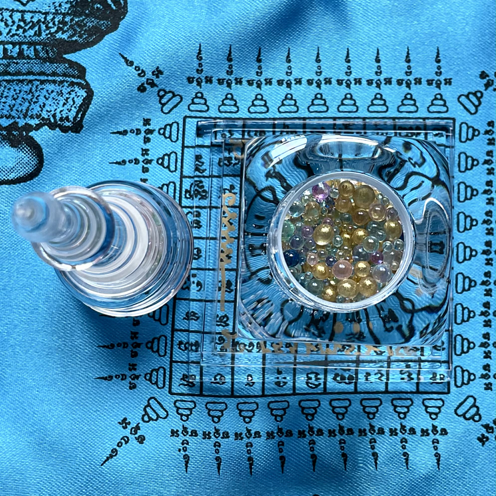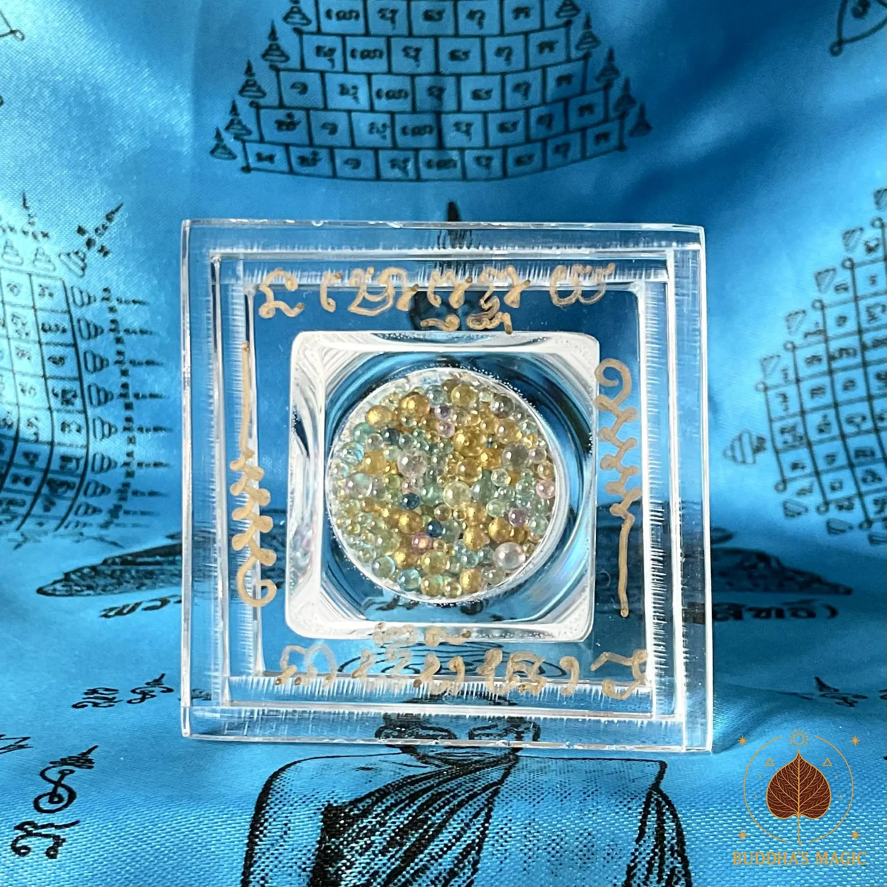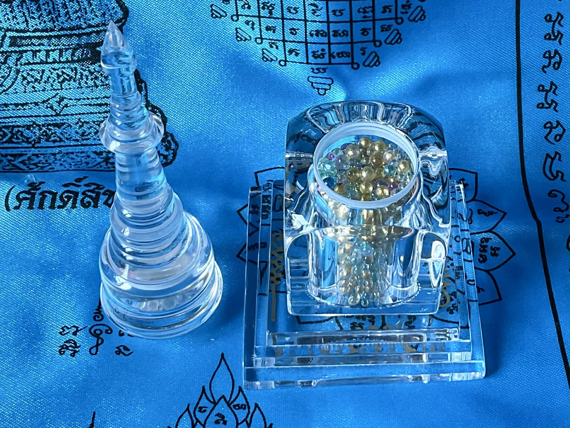 Les Sarira ne sont pas de simples reliques, mais des traces tangibles de la voie accomplie. Leurs couleurs multiples traduisent l’union des vertus, tandis que la bille Jin Gang, blanche et minérale, incarne l’axe immuable de l’éveil. Placé dans ce chedi translucide, l’ensemble agit comme un point d’ancrage spirituel, favorisant la paix intérieure, la protection subtile et la stabilité karmique.