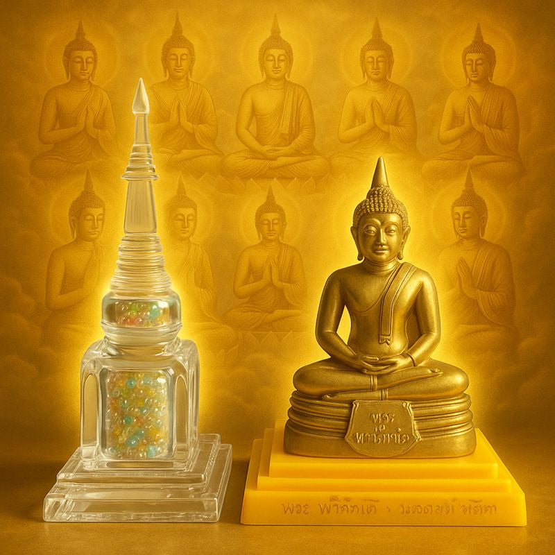 Ce type de relique est traditionnellement associé aux grands lieux de dévotion. Cet ensemble provient du Wat Luang Phor Sothorn Worawihan, l’un des temples les plus vénérés de Thaïlande, situé à Chachoengsao, sanctuaire emblématique du Bouddha Luang Phor Sothorn.