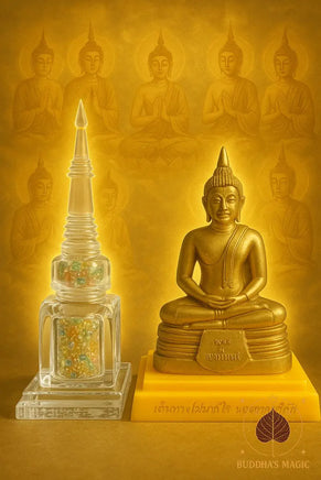 Le chedi est accompagné d’une plaque votive en laiton représentant le Bouddha Luang Phor Sothorn, renforçant le lien spirituel entre les reliques et cette figure majeure de la foi thaïlandaise. L’ensemble forme un objet de dévotion, de protection et de méditation d’une grande rareté.