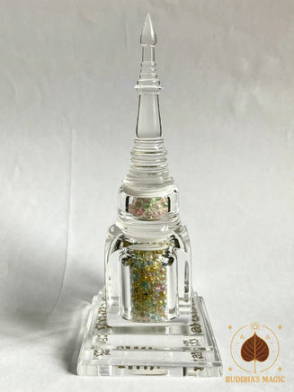 Ce précieux chedi translucide sacré renferme un ensemble exceptionnel de perles reliques Sarira multicolores, véritables manifestations cristallisées de la réalisation spirituelle dans la tradition bouddhiste. En son centre repose une bille relique minérale blanche Jin Gang, symbole d’indestructibilité, de pureté et de clarté absolue.
