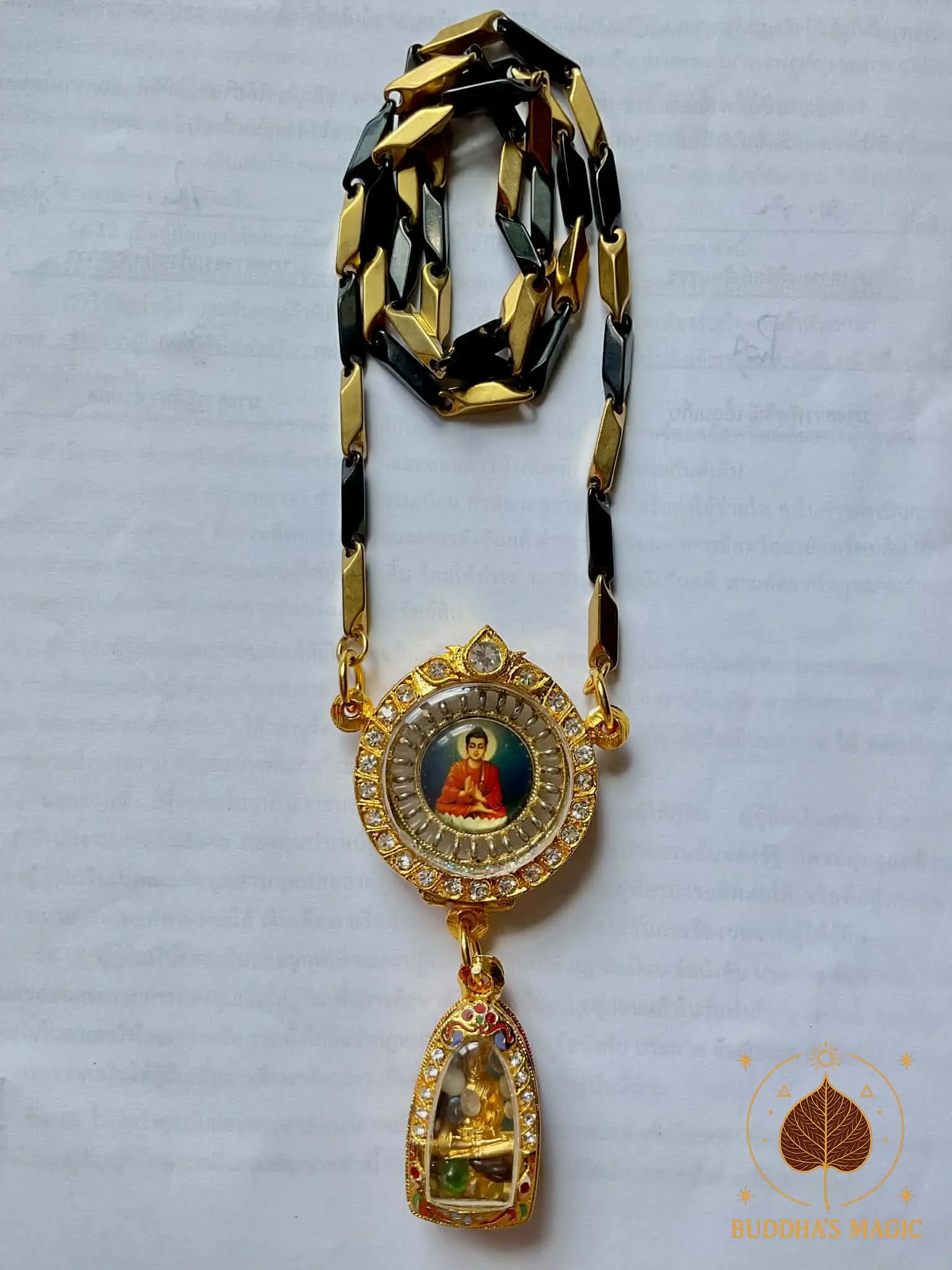 La chaîne noire et or qui accompagne ce collier est neuve. Son design moderne contraste subtilement avec les éléments anciens et traditionnels, créant un équilibre entre esthétique contemporaine et spiritualité bouddhiste.
