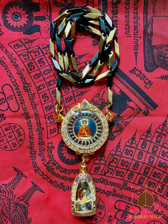 Sous cette première pièce se trouve une amulette dorée du Bouddha Luang Phor Sothorn, accompagnée de perles reliques Sarira multicolores. L’ensemble est également protégé dans un reliquaire doré neuf, mettant en valeur la dimension sacrée et symbolique de ces éléments.