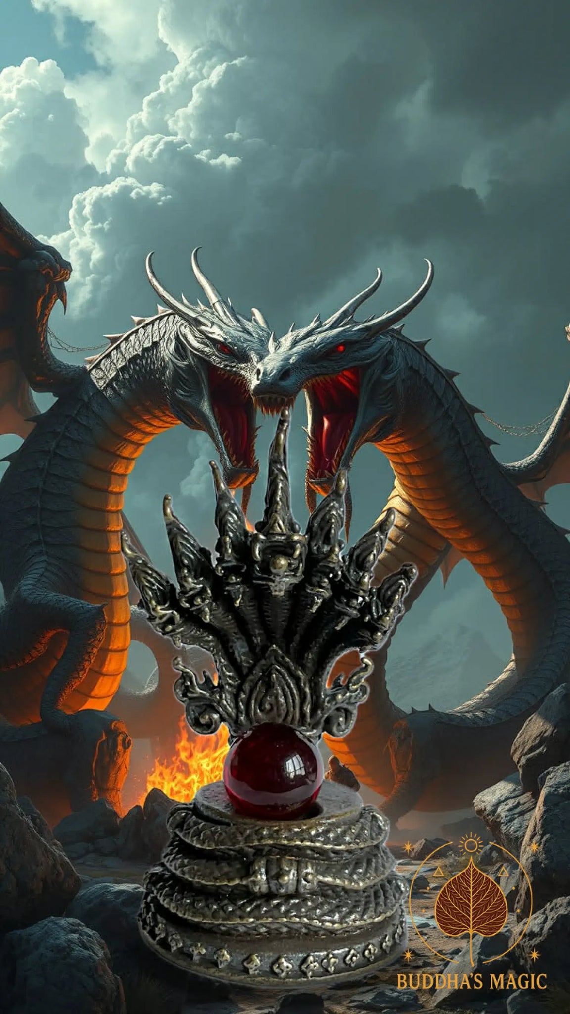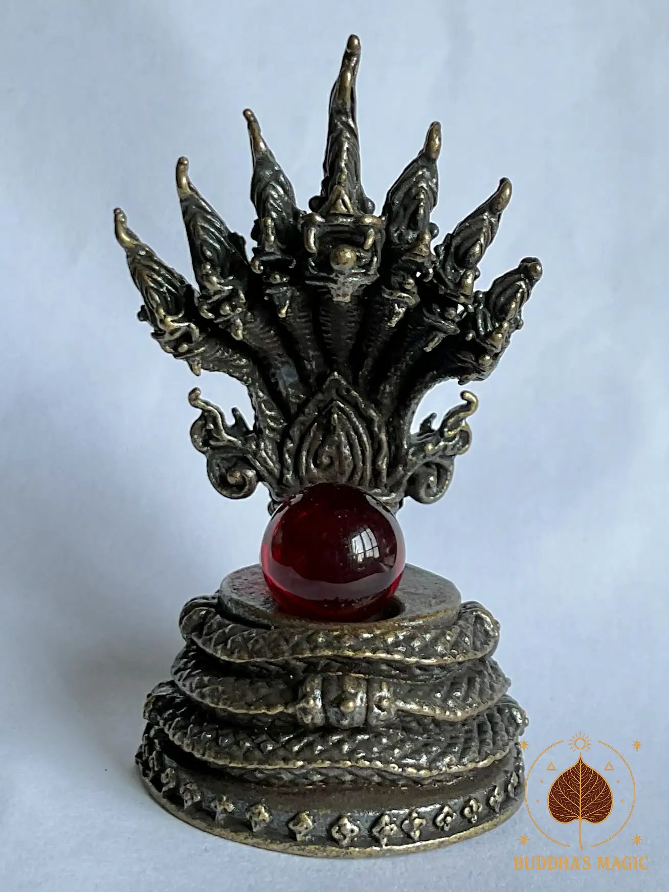 Le serpent sacré est finement détaillé, avec ses sept têtes dressées comme un éventail protecteur. La bille rouge symbolise le joyau des profondeurs, relié aux esprits des eaux et aux mondes cachés du Mékong. Cette pièce est parfaite pour un autel bouddhiste, un coin méditation ou un espace de travail que tu souhaites placer sous la garde des nagas.