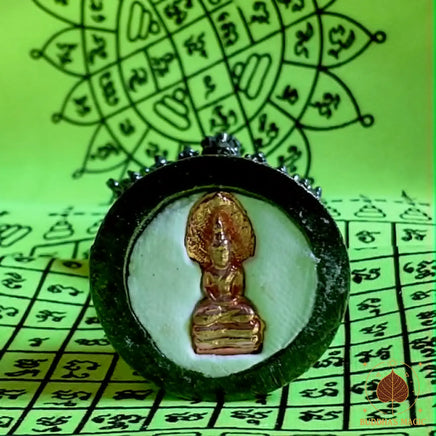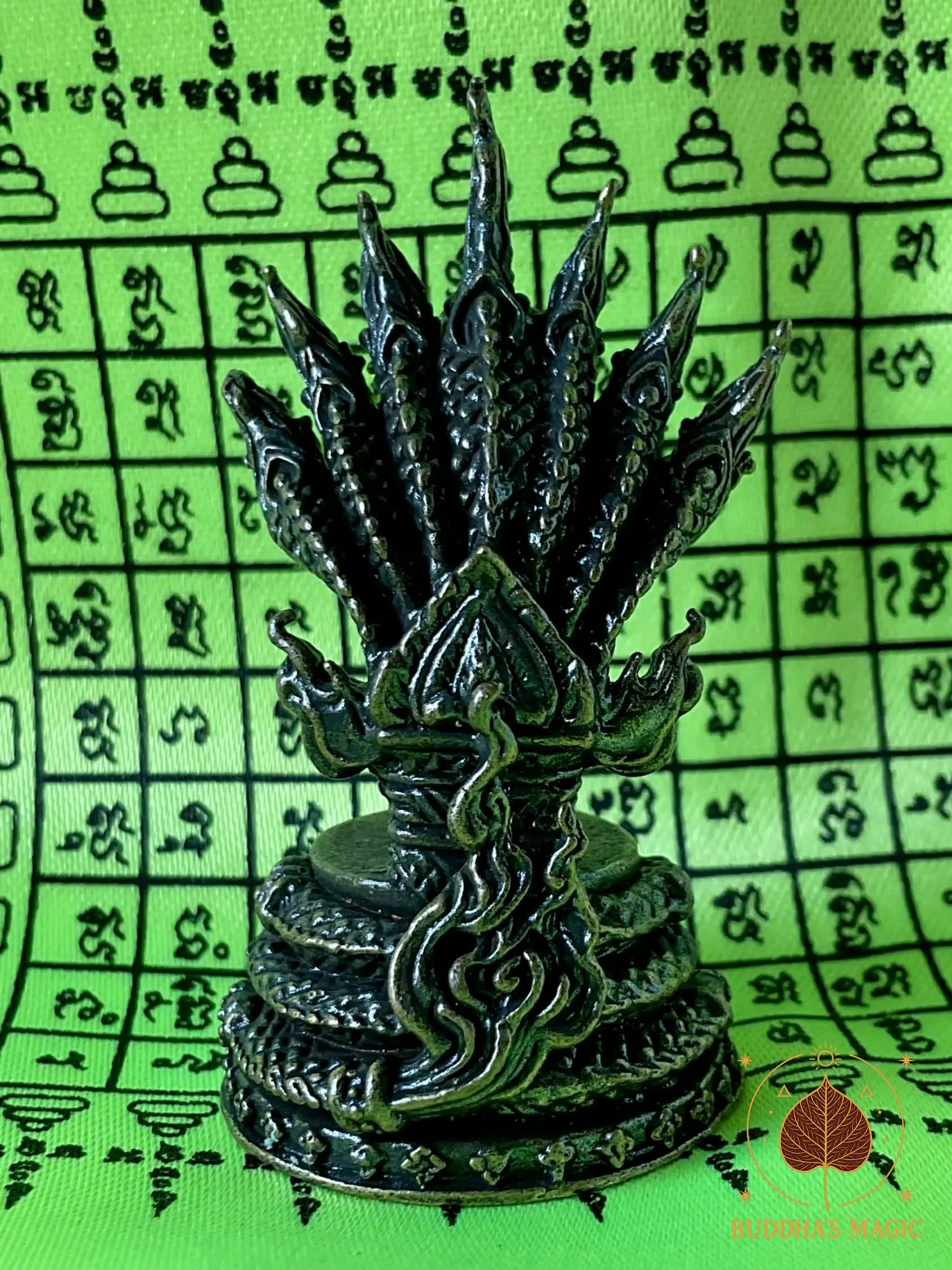 Cette petite statuette en bronze représente le Roi des Nâgas à sept têtes, enroulé sur un socle sculpté et gardant une bille de cristal des nagas Dta Payanag. Sous la base est dissimulée une petite amulette en cuivre du Bouddha Phra Naphok, qui renforce encore les énergies de protection et de stabilité.
