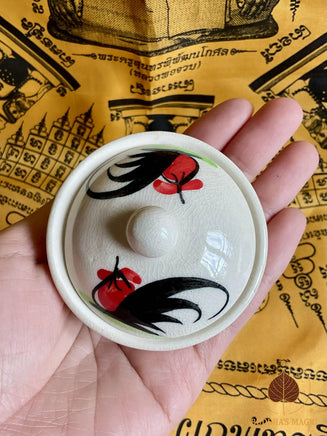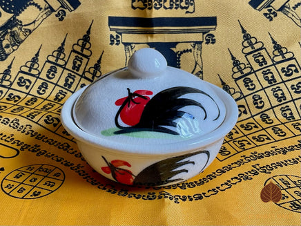 Ce reliquaire en céramique traditionnelle provient de la région de Lampang, connue pour son artisanat ancien et ses motifs symboliques. Le décor représente un coq de combat, figure emblématique de courage, de vigilance et de vitalité dans la tradition thaïlandaise.